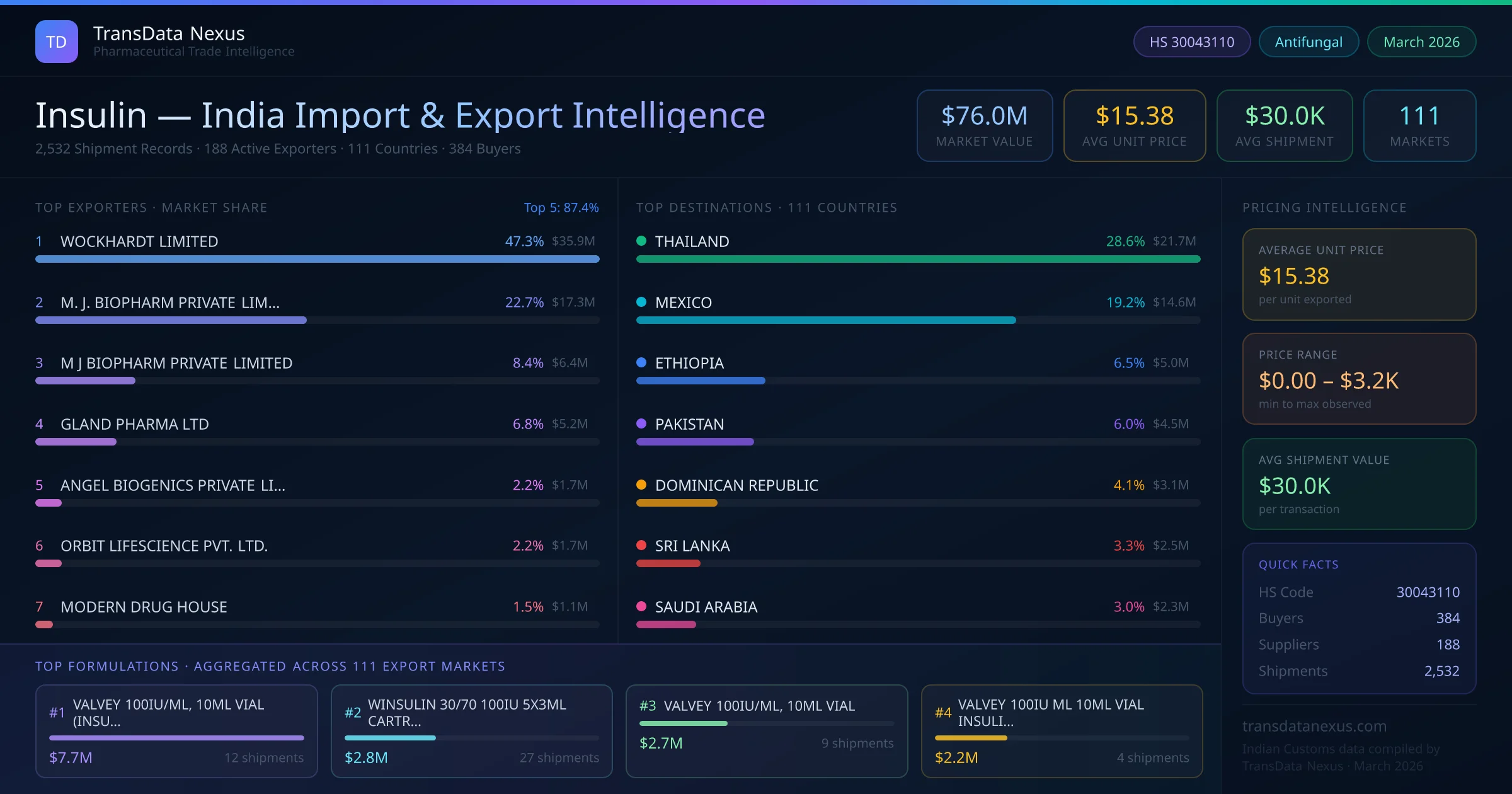Between 2022 and 2026, India exported $76.0M worth of insulin across 2,532 verified shipments to 111 countries — covering 57% of world markets in the Diabetes & Endocrine segment. The largest destination is THAILAND (28.6%). WOCKHARDT LIMITED leads with a 47.3% share. All figures are drawn from Indian Customs (DGFT) shipping bill records spanning four years of trade activity.