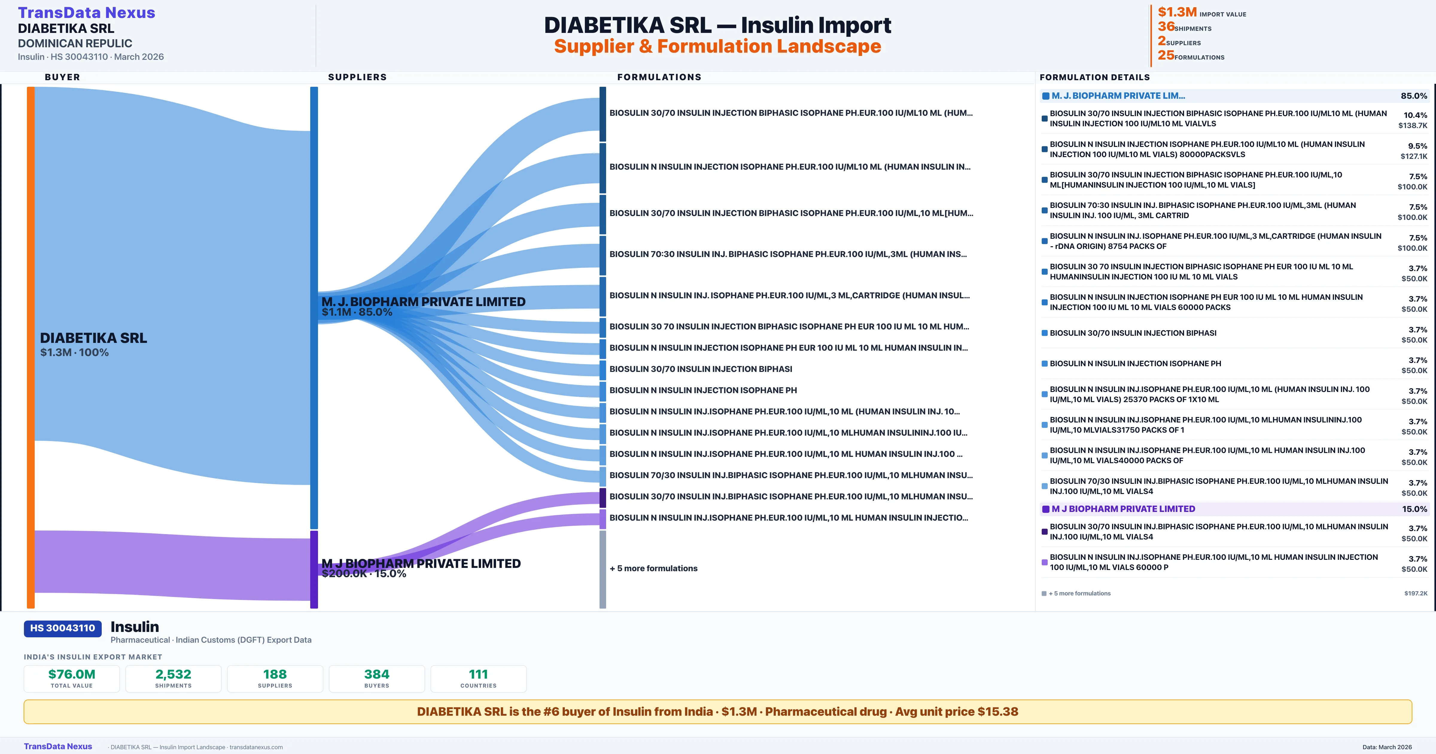 DIABETIKA SRL sources Insulin from 2 verified Indian suppliers: M. J. BIOPHARM PRIVATE LIMITED ($1.1M, 85.0%), M J BIOPHARM PRIVATE LIMITED ($200.0K, 15.0%). This is based on 36 customs records.