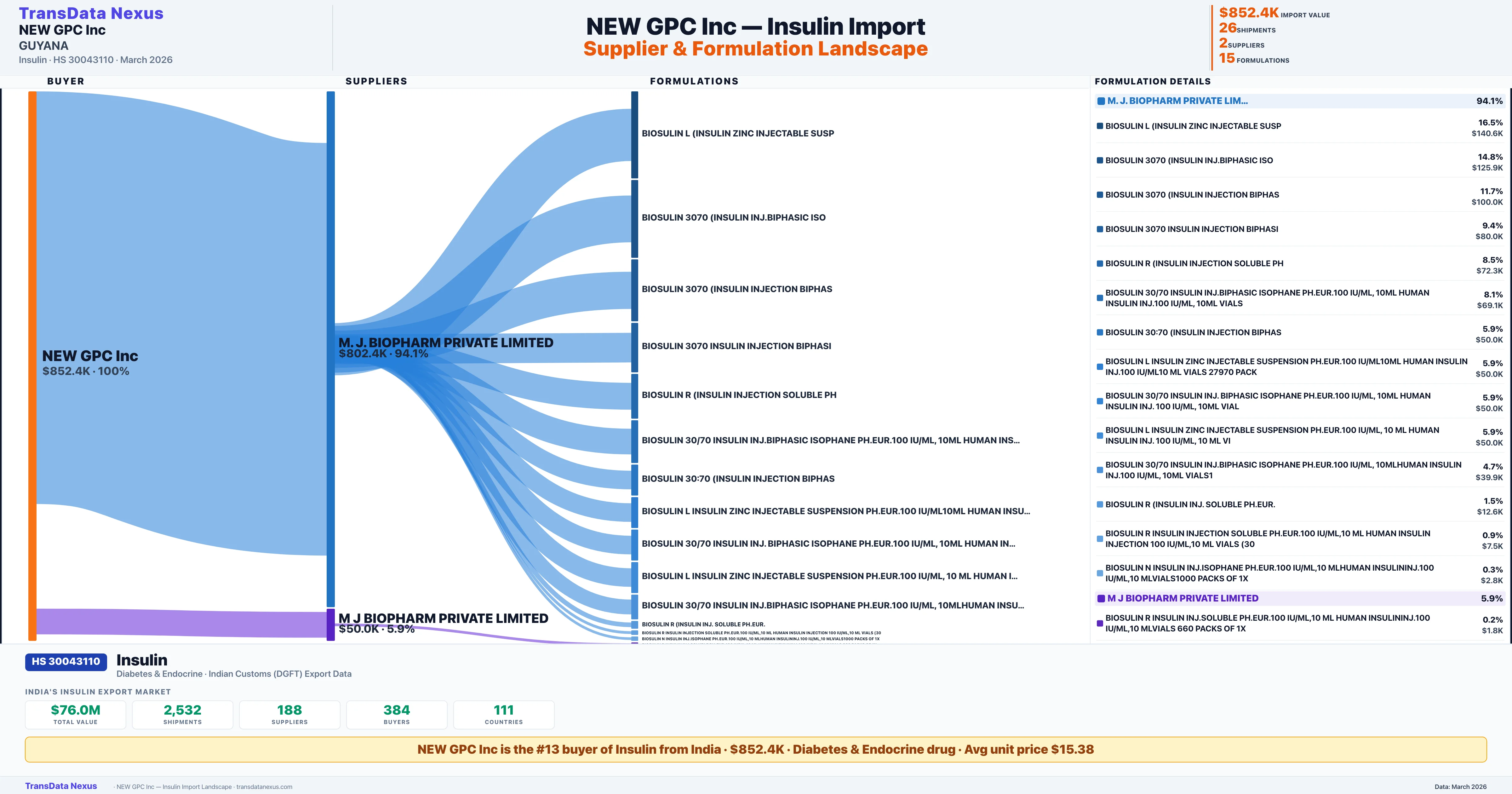 NEW GPC INC sources Insulin from 2 verified Indian suppliers: M. J. BIOPHARM PRIVATE LIMITED ($802.4K, 94.1%), M J BIOPHARM PRIVATE LIMITED ($50.0K, 5.9%). This is based on 26 customs records.