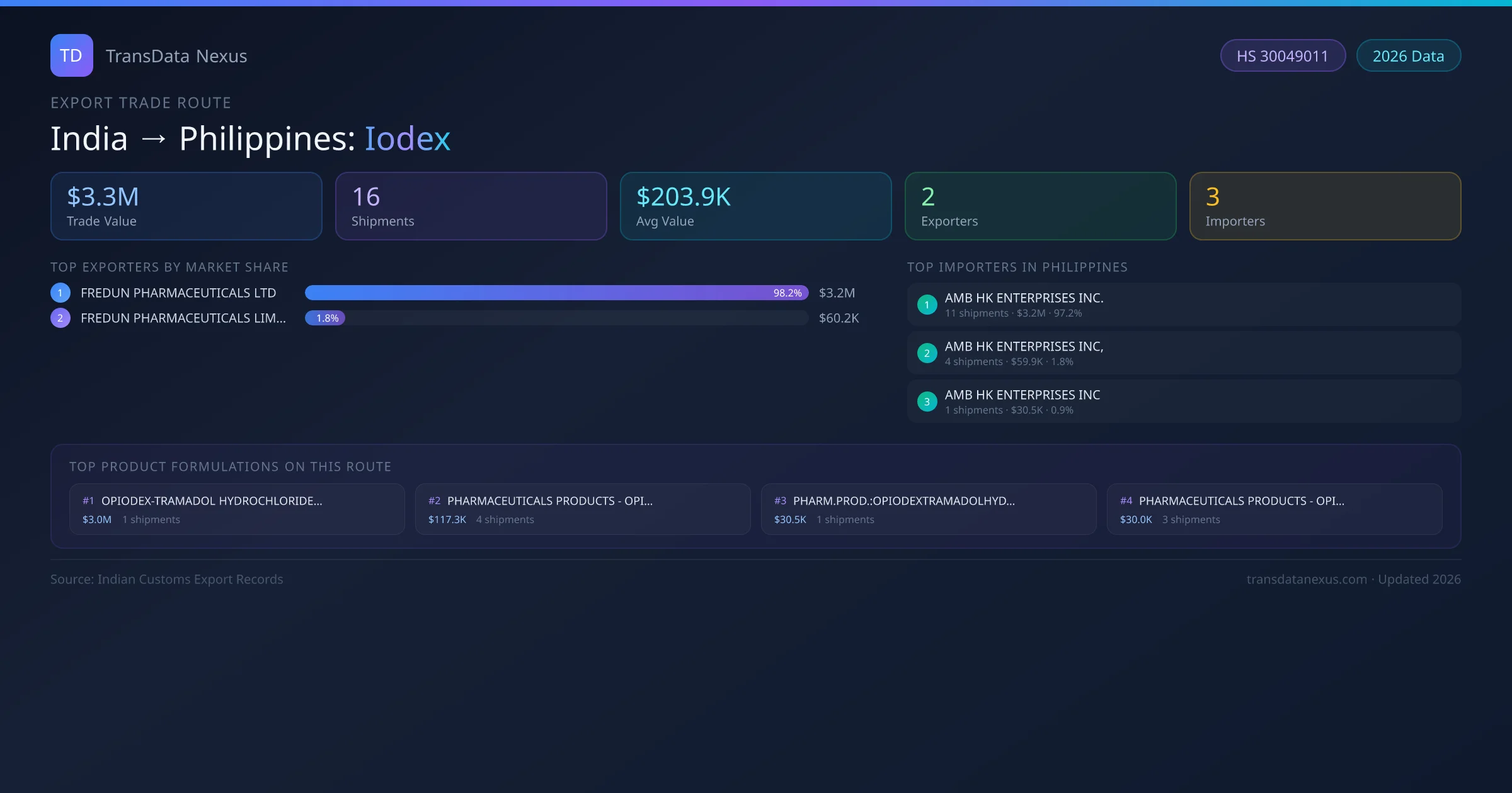 India has recorded 16 verified shipments of Iodex exported to Philippines, representing a combined trade value of $3.3M USD. This corridor is served by 2 active Indian exporters, with an average shipment value of $203.9K USD. The leading Indian exporter is FREDUN PHARMACEUTICALS LTD, which accounts for 98% of total export value with 12 shipments worth $3.2M USD. On the buying side, AMB HK ENTERPRISES INC. is the largest importer in Philippines with $3.2M USD in purchases. All data sourced from Indian Customs (DGFT) shipping bill records. Values reported in FOB USD.