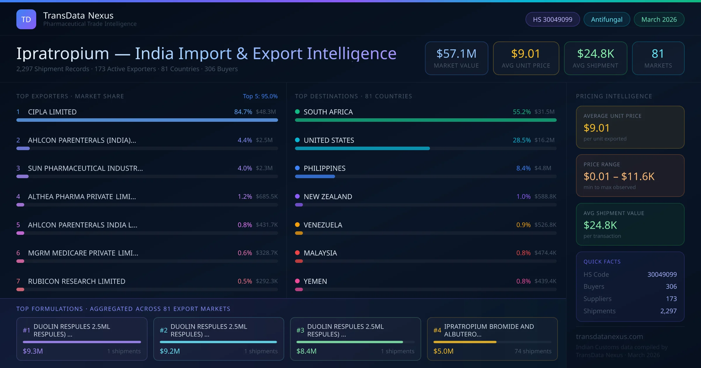 Between 2022 and 2026, India exported $57.1M worth of ipratropium across 2,297 verified shipments to 81 countries — covering 42% of world markets in the Respiratory & OTC segment. The largest destination is SOUTH AFRICA (55.2%). CIPLA LIMITED leads with a 84.7% share. All figures are drawn from Indian Customs (DGFT) shipping bill records spanning four years of trade activity.