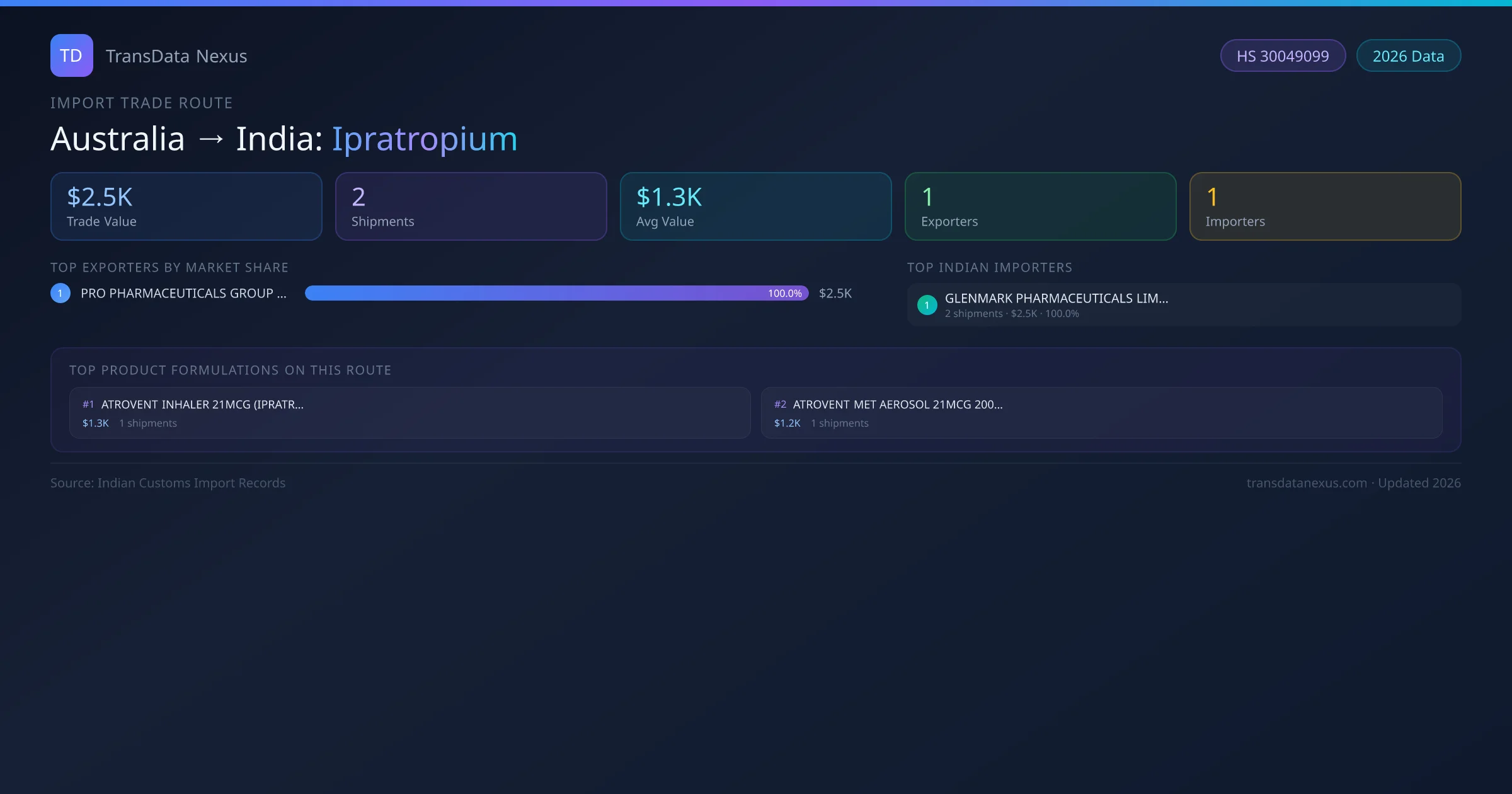On the buying side, GLENMARK PHARMACEUTICALS LIMITED is the largest importer with 2 shipments worth $2.5K USD — representing 100% of all ipratropium imports from Australia on this route.