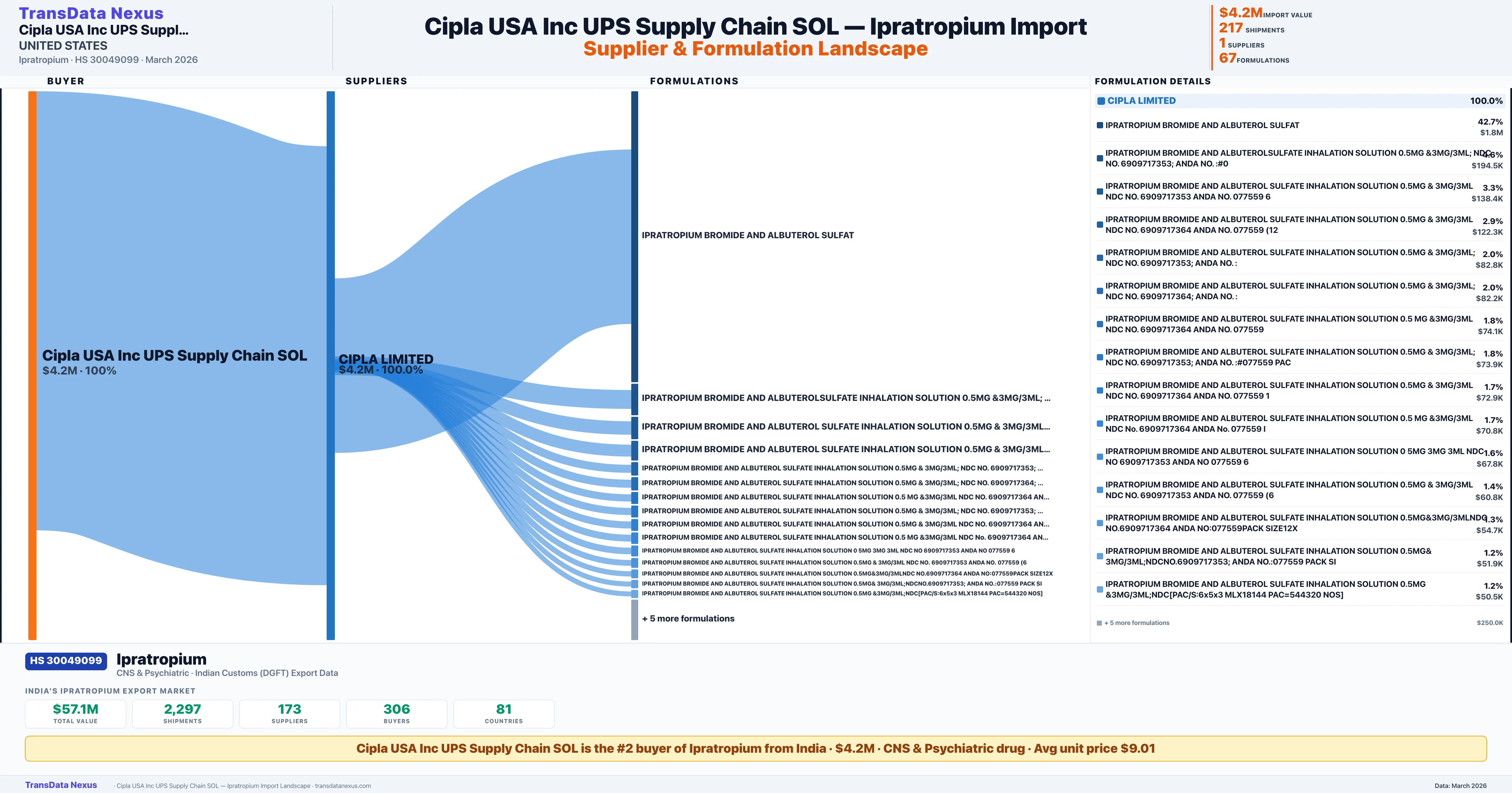 CIPLA USA INC UPS SUPPLY CHAIN SOL imports 67 distinct Ipratropium formulations from India. The top formulation is IPRATROPIUM BROMIDE AND ALBUTEROL SULFAT with 50 shipments worth $1.8M.