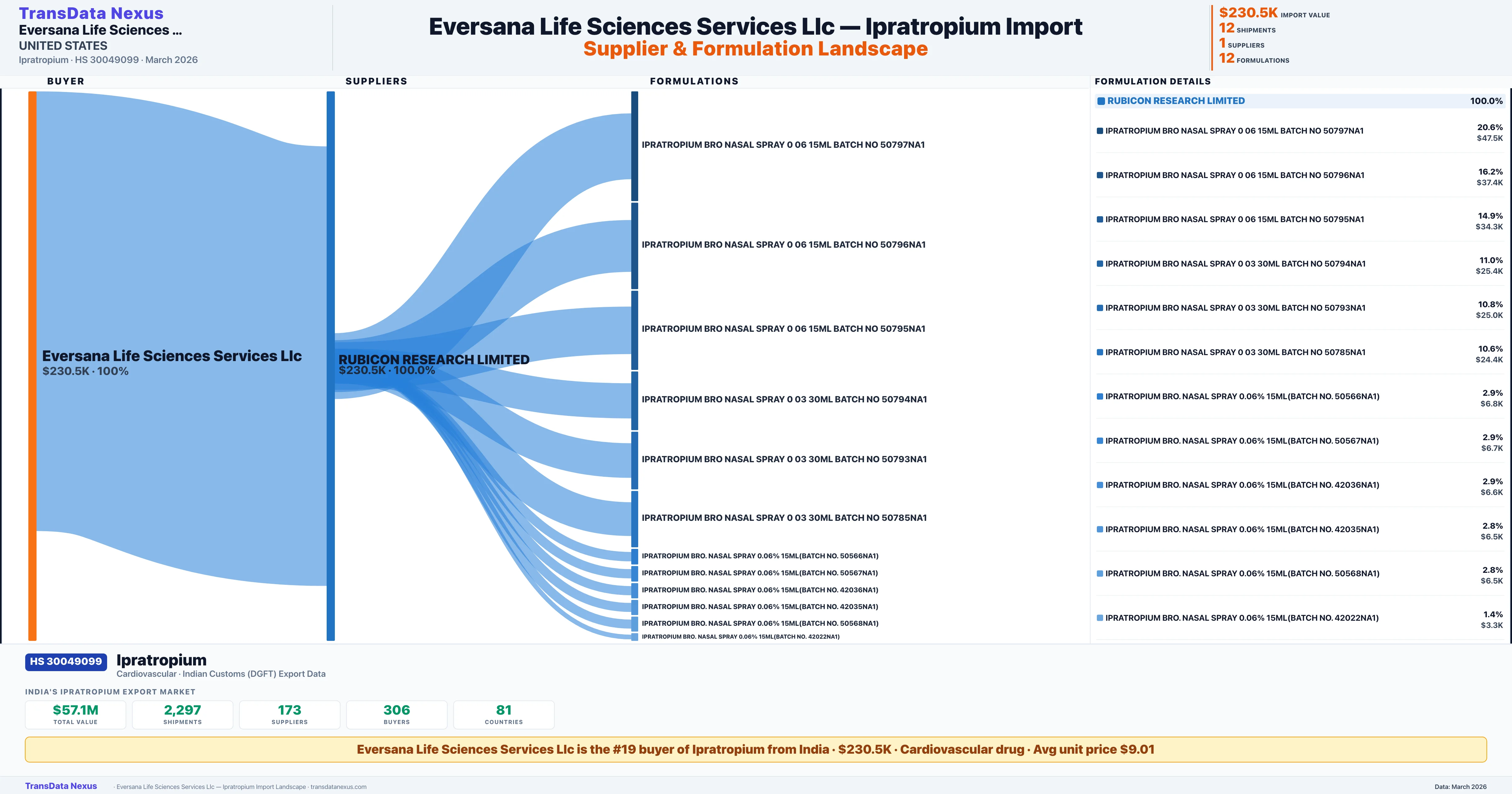 EVERSANA LIFE SCIENCES SERVICES LLC imports 12 distinct Ipratropium formulations from India. The top formulation is IPRATROPIUM BRO NASAL SPRAY 0 06 15ML BATCH NO 50797NA1 with 1 shipments worth $47.5K.
