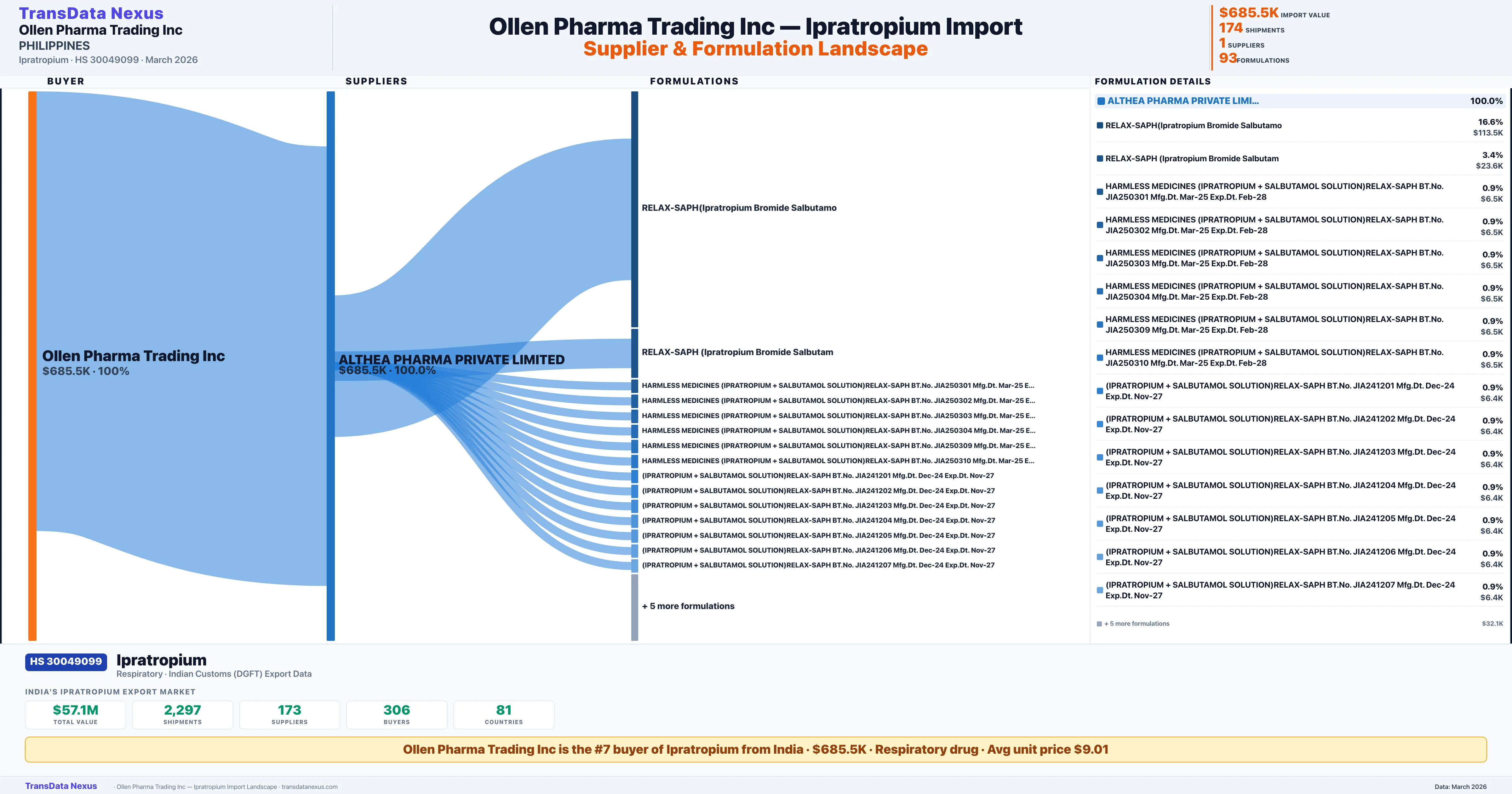 OLLEN PHARMA TRADING INC sources Ipratropium from 1 verified Indian supplier: ALTHEA PHARMA PRIVATE LIMITED ($685.5K, 100.0%). This is based on 174 customs records.