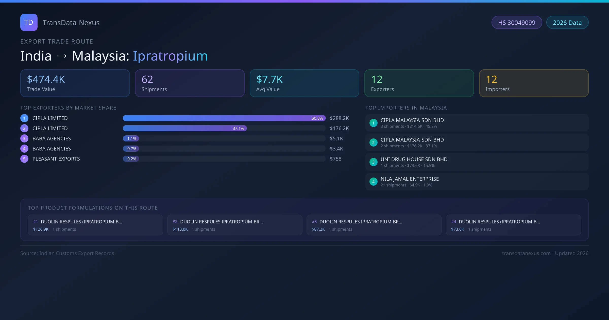 - 1.Route Identification: India to Malaysia export trade corridor identified from Indian Customs (DGFT) records for Ipratropium.