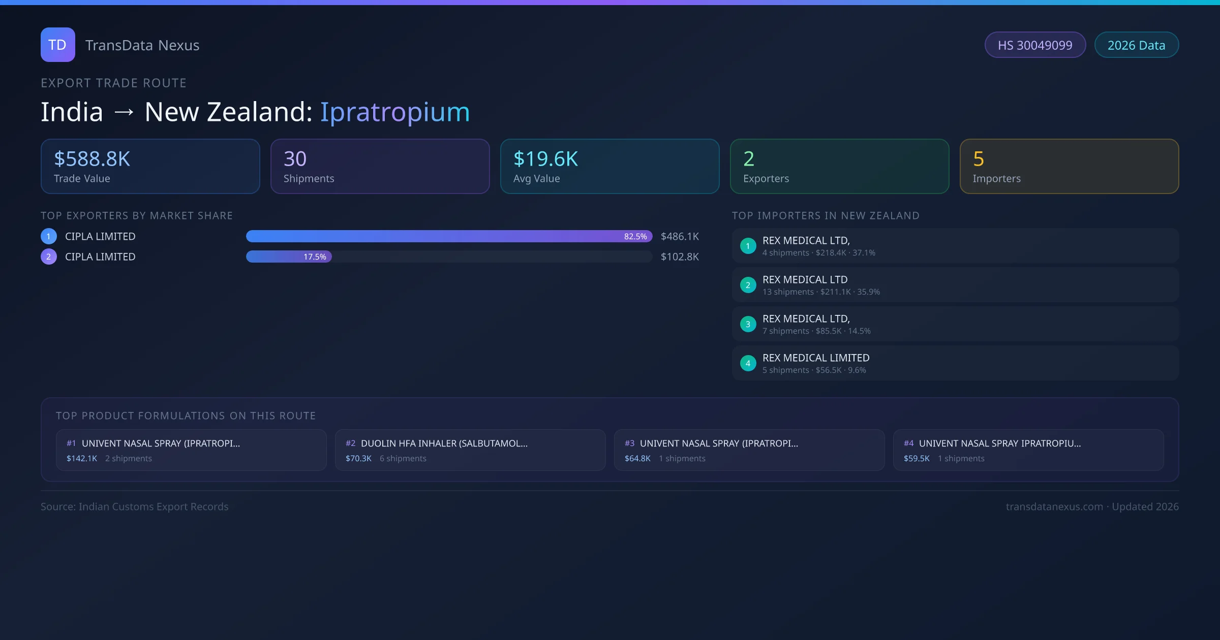 The India to New Zealand Ipratropium corridor is one of India's established pharmaceutical export routes, with 30 shipments documented worth a combined $588.8K USD. The route is dominated by CIPLA LIMITED, which alone accounts for roughly 83% of all export value, reflecting the consolidated nature of India's ipratropium manufacturing sector.