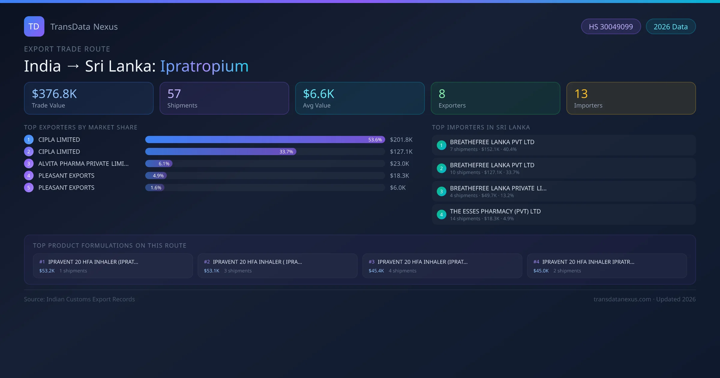 The India to Sri Lanka Ipratropium corridor is one of India's established pharmaceutical export routes, with 57 shipments documented worth a combined $376.8K USD. The route is dominated by CIPLA LIMITED, which alone accounts for roughly 54% of all export value, reflecting the consolidated nature of India's ipratropium manufacturing sector.