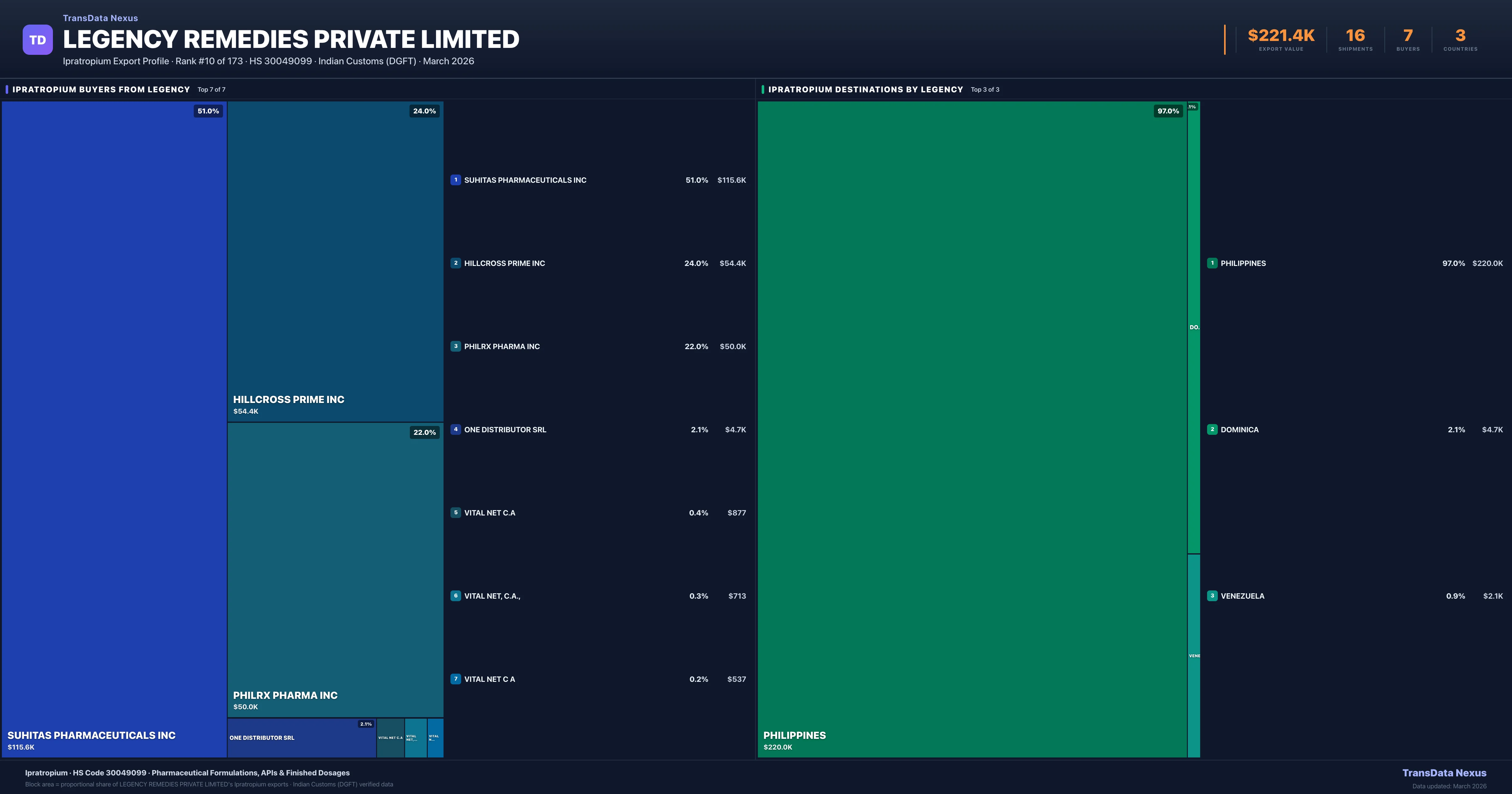 Legency Remedies Private Limited supplies Ipratropium to 7 buyers globally. The largest buyer is SUHITAS PHARMACEUTICALS INC (PHILIPPINES), followed by HILLCROSS PRIME INC (PHILIPPINES) and PHILRX PHARMA INC (PHILIPPINES). These buyers represent pharmaceutical distributors, hospital groups, and government procurement agencies in their respective markets.