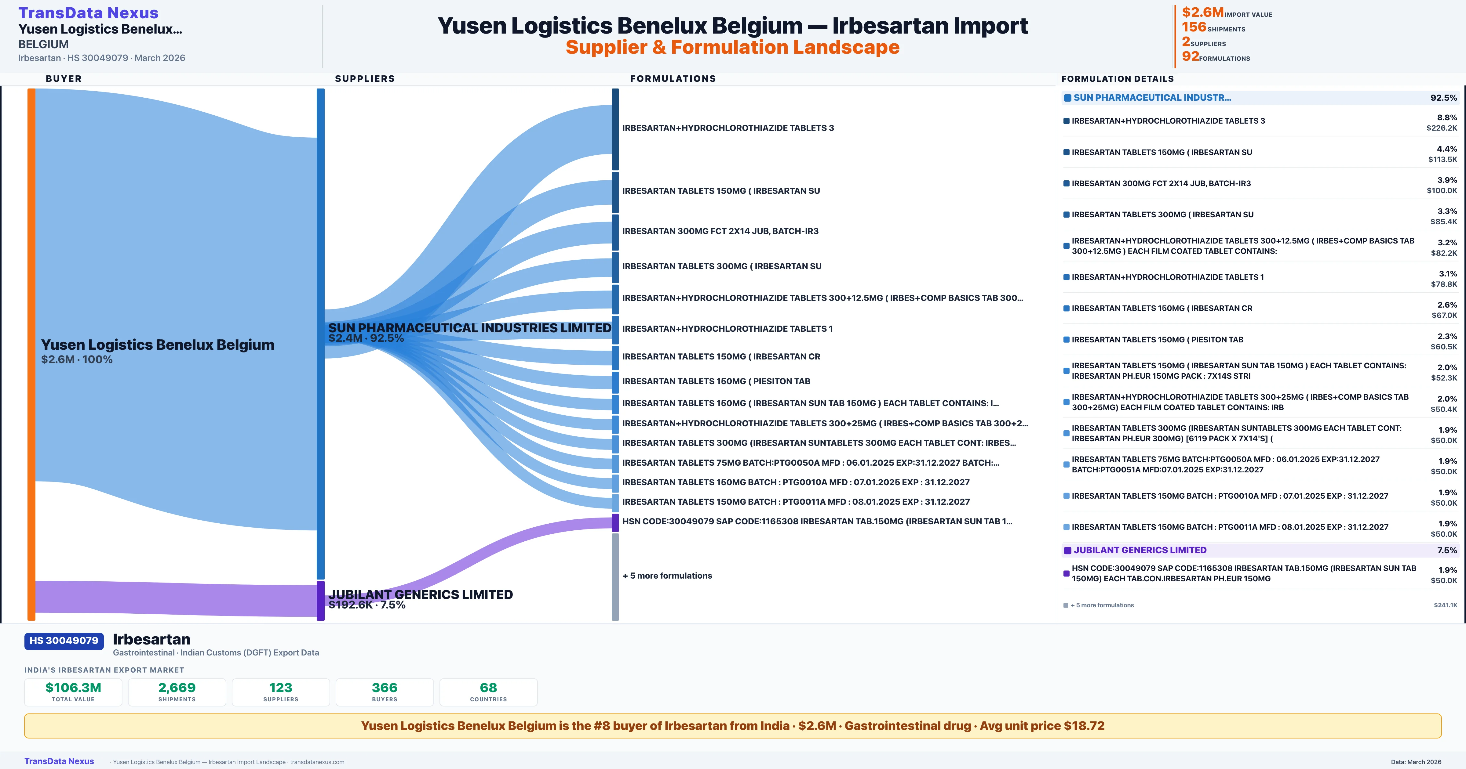 YUSEN LOGISTICS BENELUX BELGIUM sources Irbesartan from 2 verified Indian suppliers: SUN PHARMACEUTICAL INDUSTRIES LIMITED ($2.4M, 92.5%), JUBILANT GENERICS LIMITED ($192.6K, 7.5%). This is based on 156 customs records.