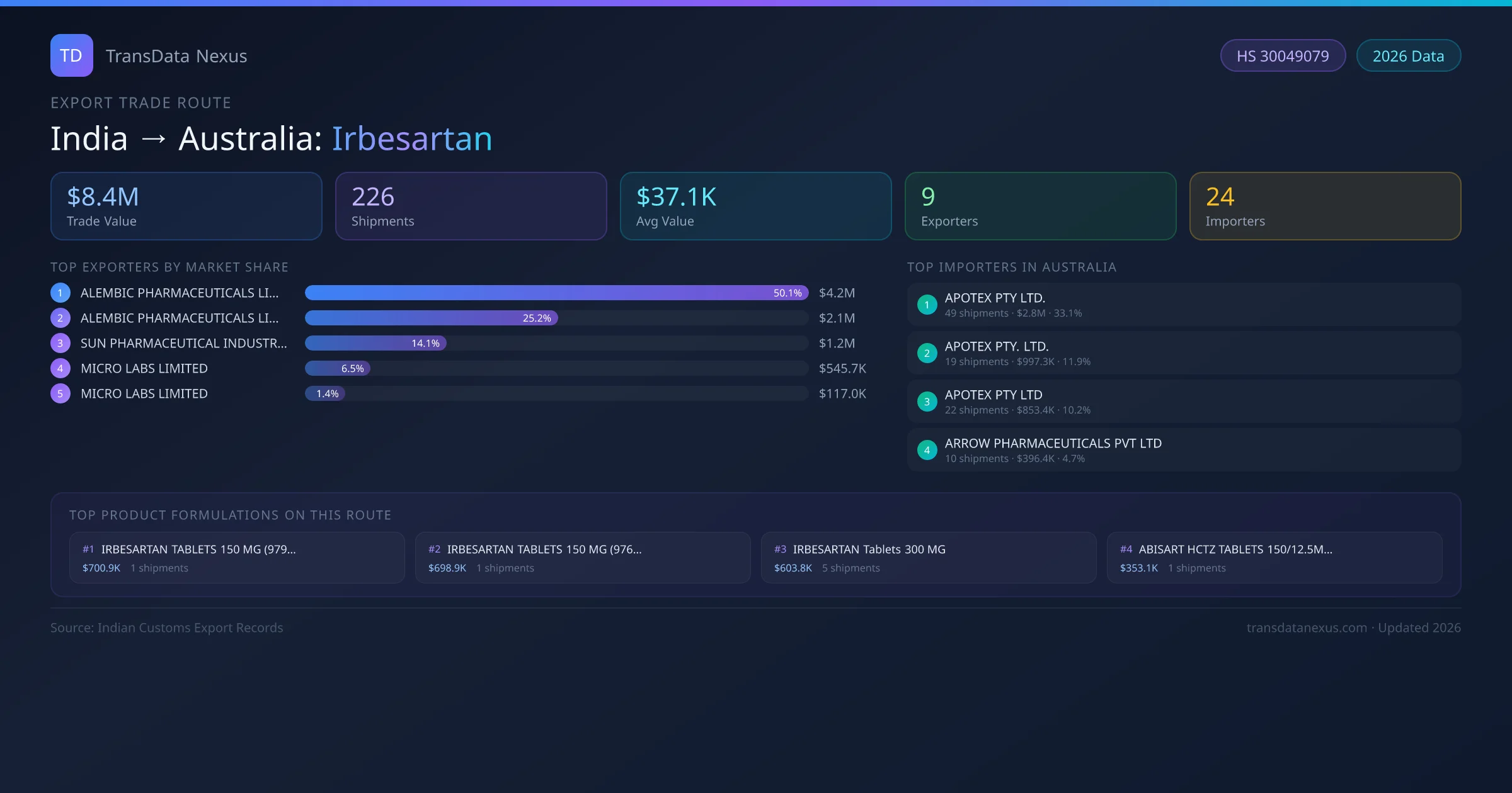- 1.Route Identification: India to Australia export trade corridor identified from Indian Customs (DGFT) records for Irbesartan.