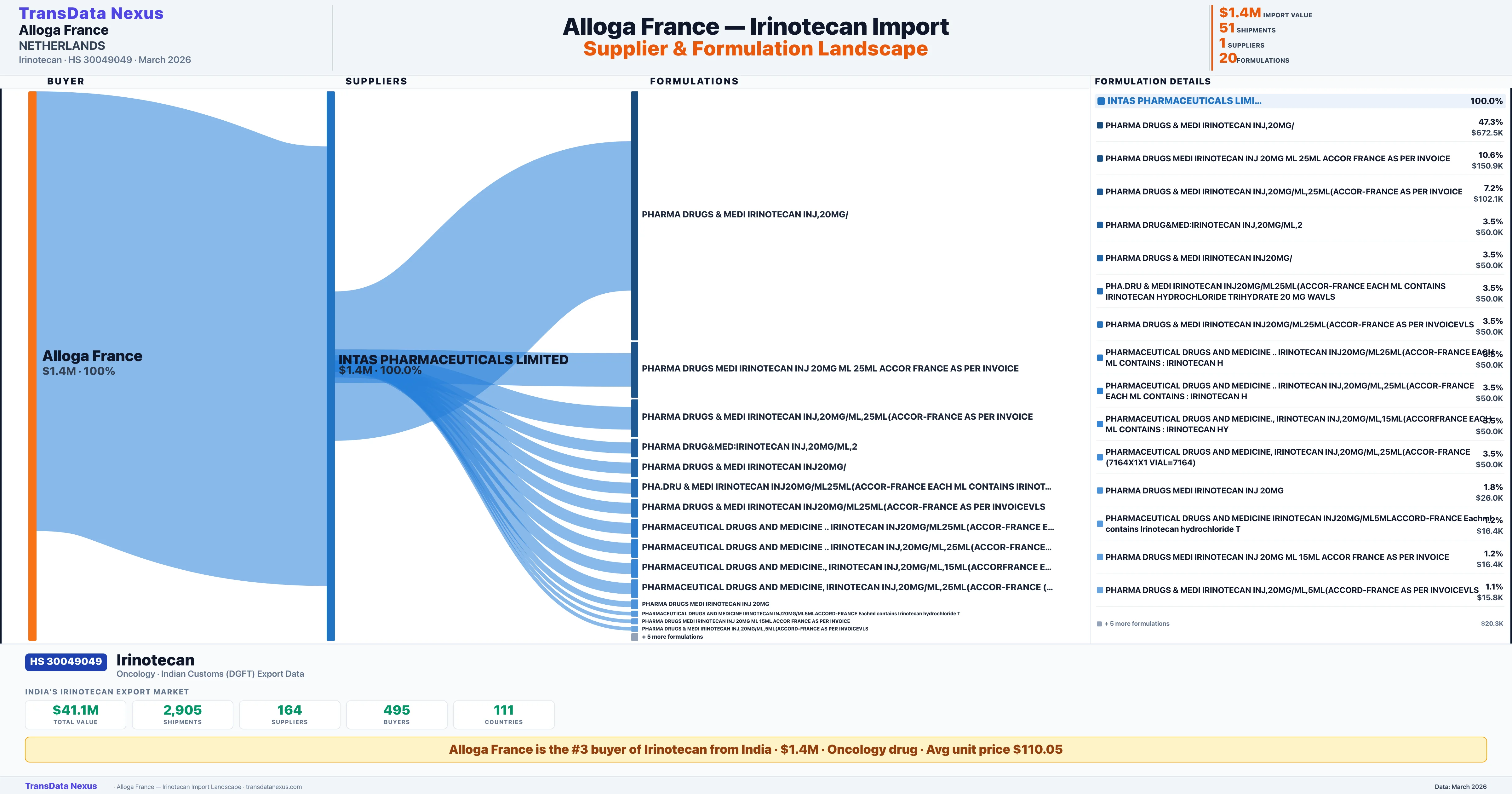 ALLOGA FRANCE sources Irinotecan from 1 verified Indian supplier: INTAS PHARMACEUTICALS LIMITED ($1.4M, 100.0%). This is based on 51 customs records.
