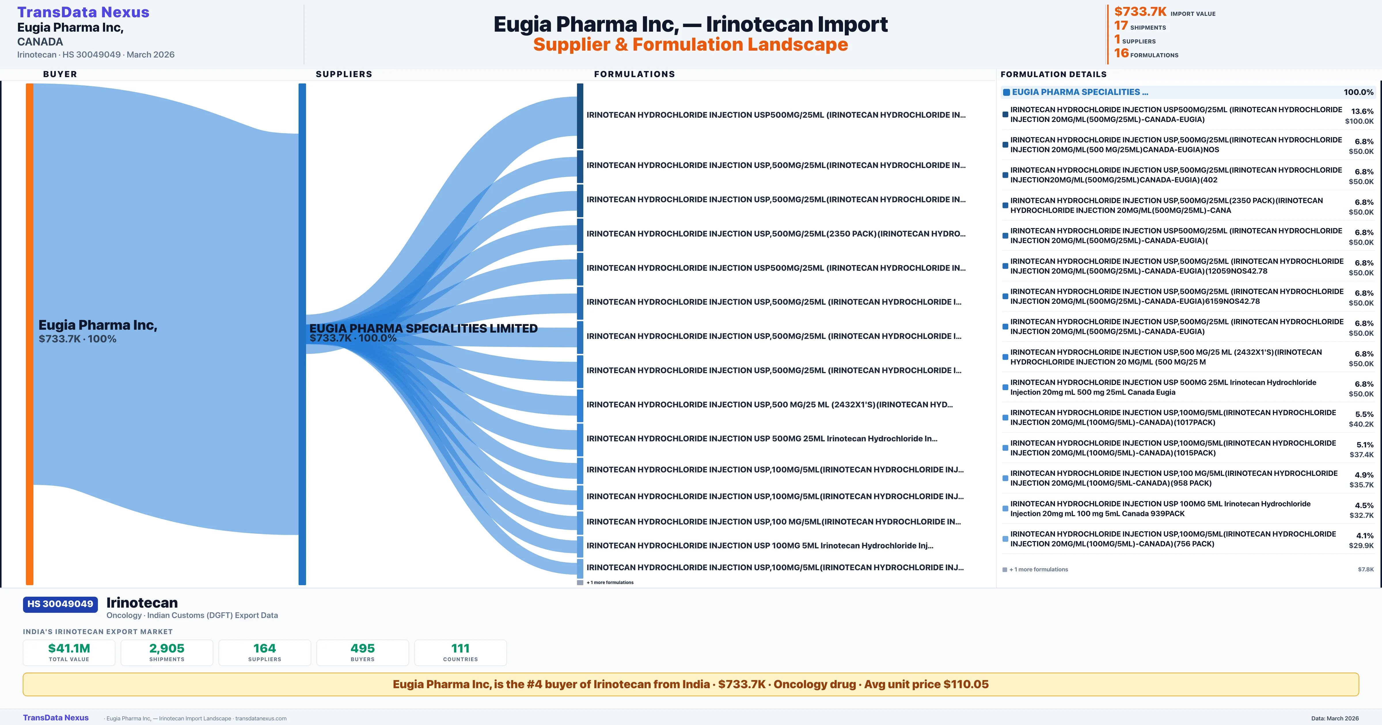 EUGIA PHARMA INC sources Irinotecan from 1 verified Indian supplier: EUGIA PHARMA SPECIALITIES LIMITED ($733.7K, 100.0%). This is based on 17 customs records.