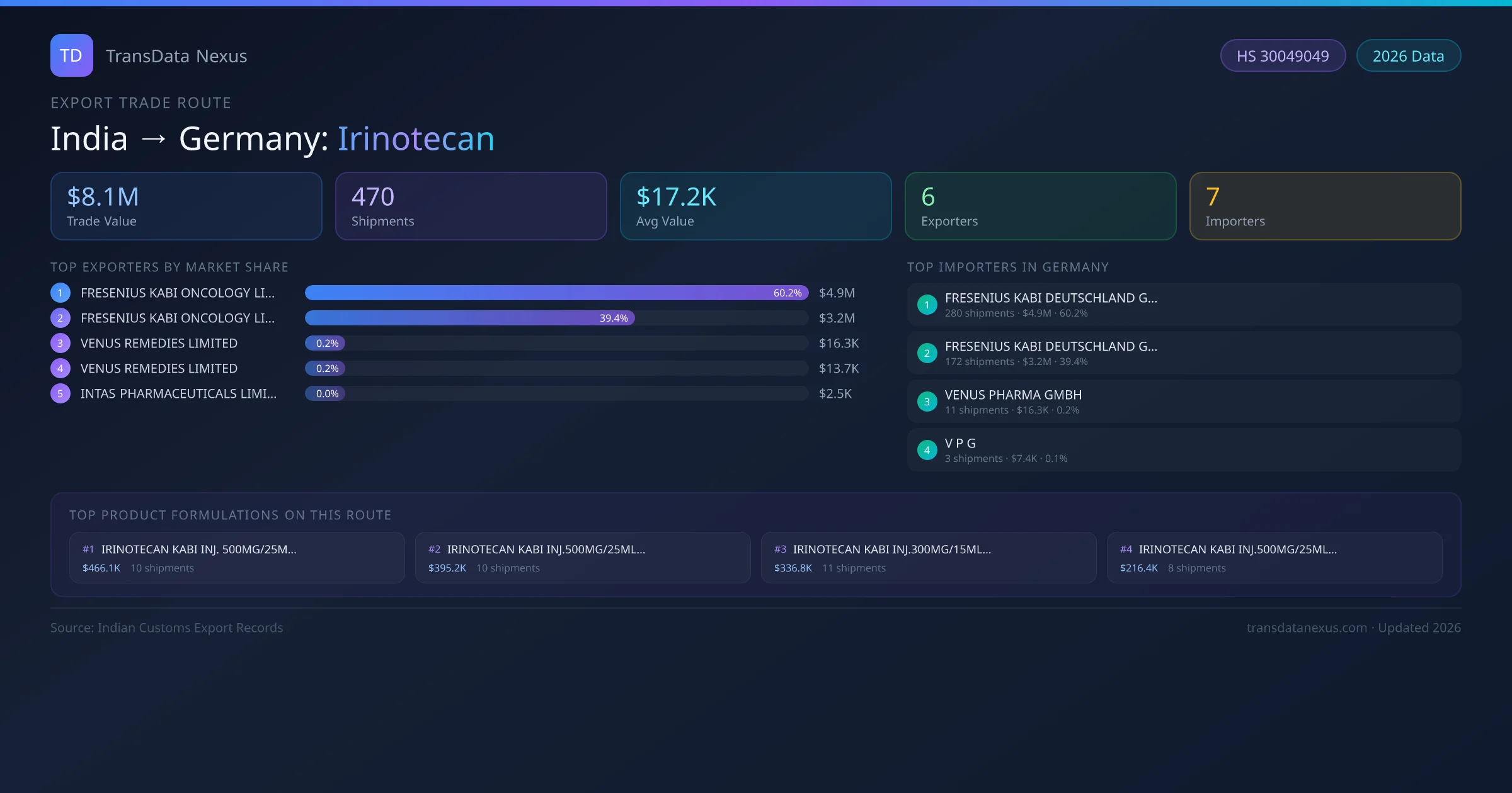 India has recorded 470 verified shipments of Irinotecan exported to Germany, representing a combined trade value of $8.1M USD. This corridor is served by 6 active Indian exporters, with an average shipment value of $17.2K USD. The leading Indian exporter is FRESENIUS KABI ONCOLOGY LIMITED, which accounts for 60% of total export value with 280 shipments worth $4.9M USD. On the buying side, FRESENIUS KABI DEUTSCHLAND GMBH is the largest importer in Germany with $4.9M USD in purchases. The top 3 suppliers — FRESENIUS KABI ONCOLOGY LIMITED, FRESENIUS KABI ONCOLOGY LIMITED , VENUS REMEDIES LIMITED — together control 100% of total trade value on this route. All data sourced from Indian Customs (DGFT) shipping bill records. Values reported in FOB USD.