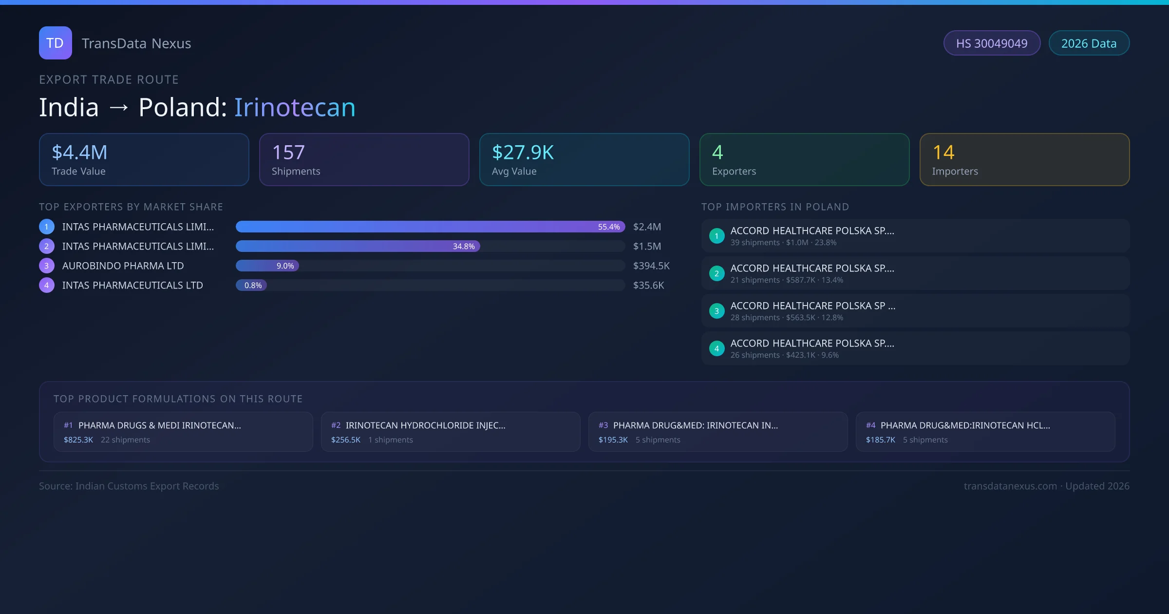 India exports Irinotecan to Poland worth approximately $4.4M USD across 157 recorded shipments. The average value per shipment is $27.9K USD.