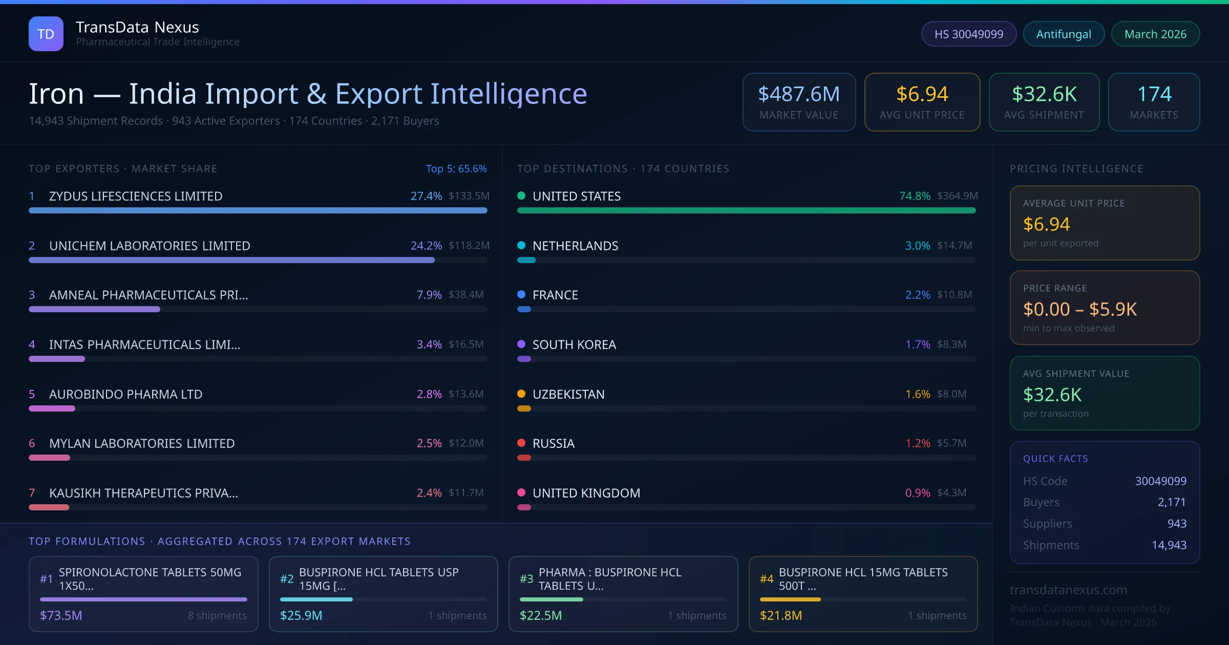 Between 2022 and 2026, India exported $487.6M worth of iron across 14,943 verified shipments to 174 countries — covering 89% of world markets in the Nutritional Supplements segment. The largest destination is UNITED STATES (74.8%). ZYDUS LIFESCIENCES LIMITED leads with a 27.4% share. All figures are drawn from Indian Customs (DGFT) shipping bill records spanning four years of trade activity.