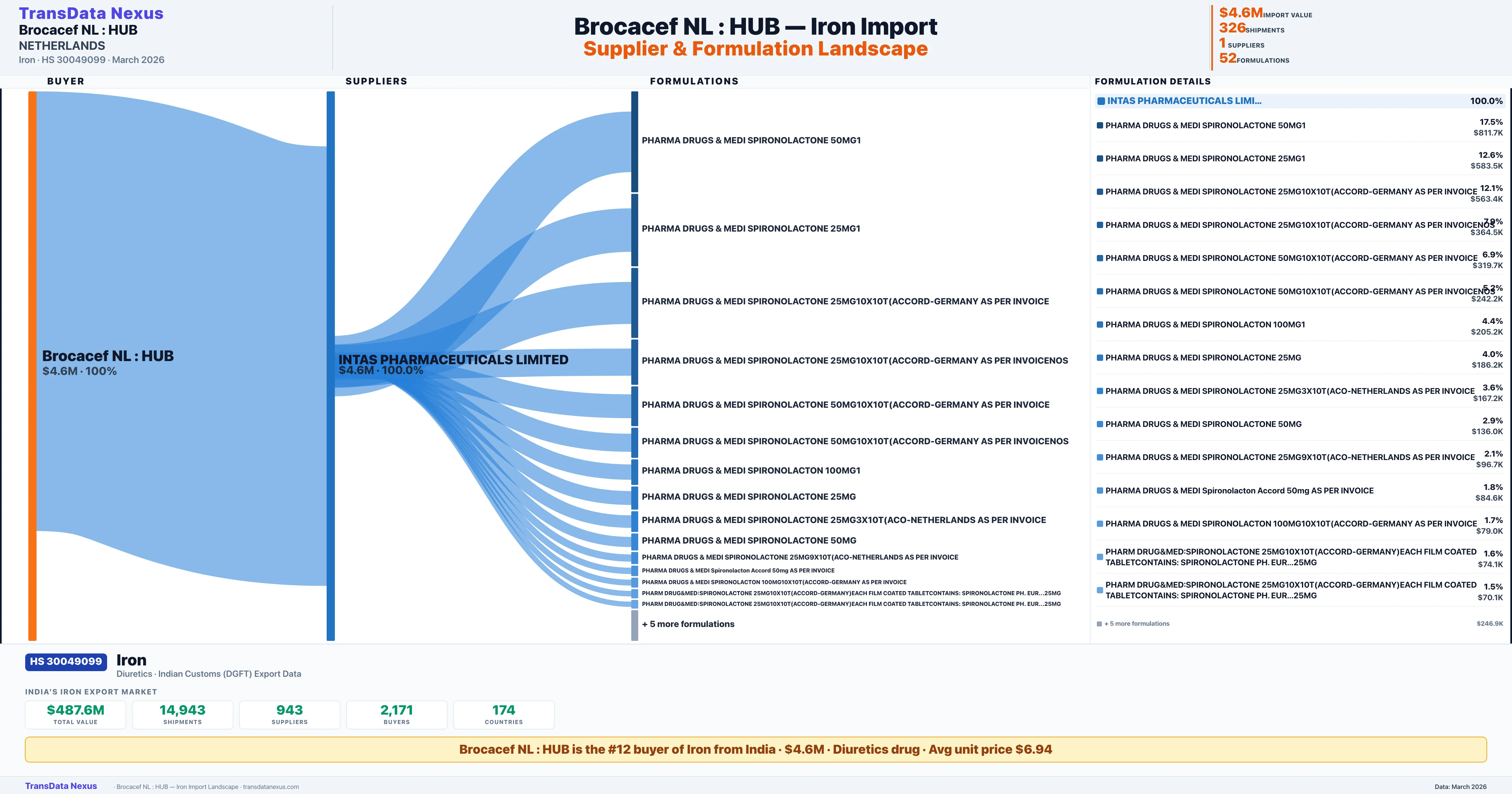 BROCACEF NL : HUB sources Iron from 1 verified Indian supplier: INTAS PHARMACEUTICALS LIMITED ($4.6M, 100.0%). This is based on 326 customs records.