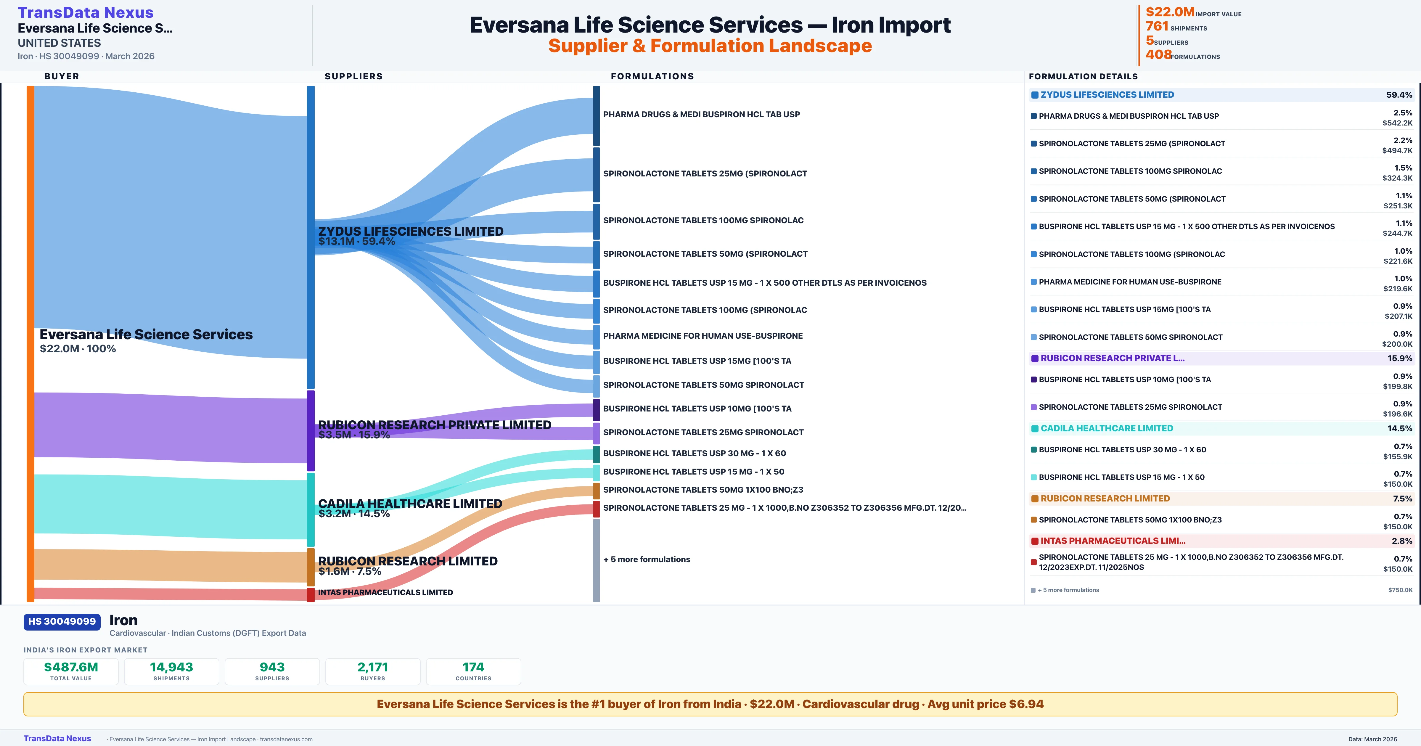 EVERSANA LIFE SCIENCE SERVICES imports 408 distinct Iron formulations from India. The top formulation is PHARMA DRUGS & MEDI BUSPIRON HCL TAB USP with 18 shipments worth $542.2K.