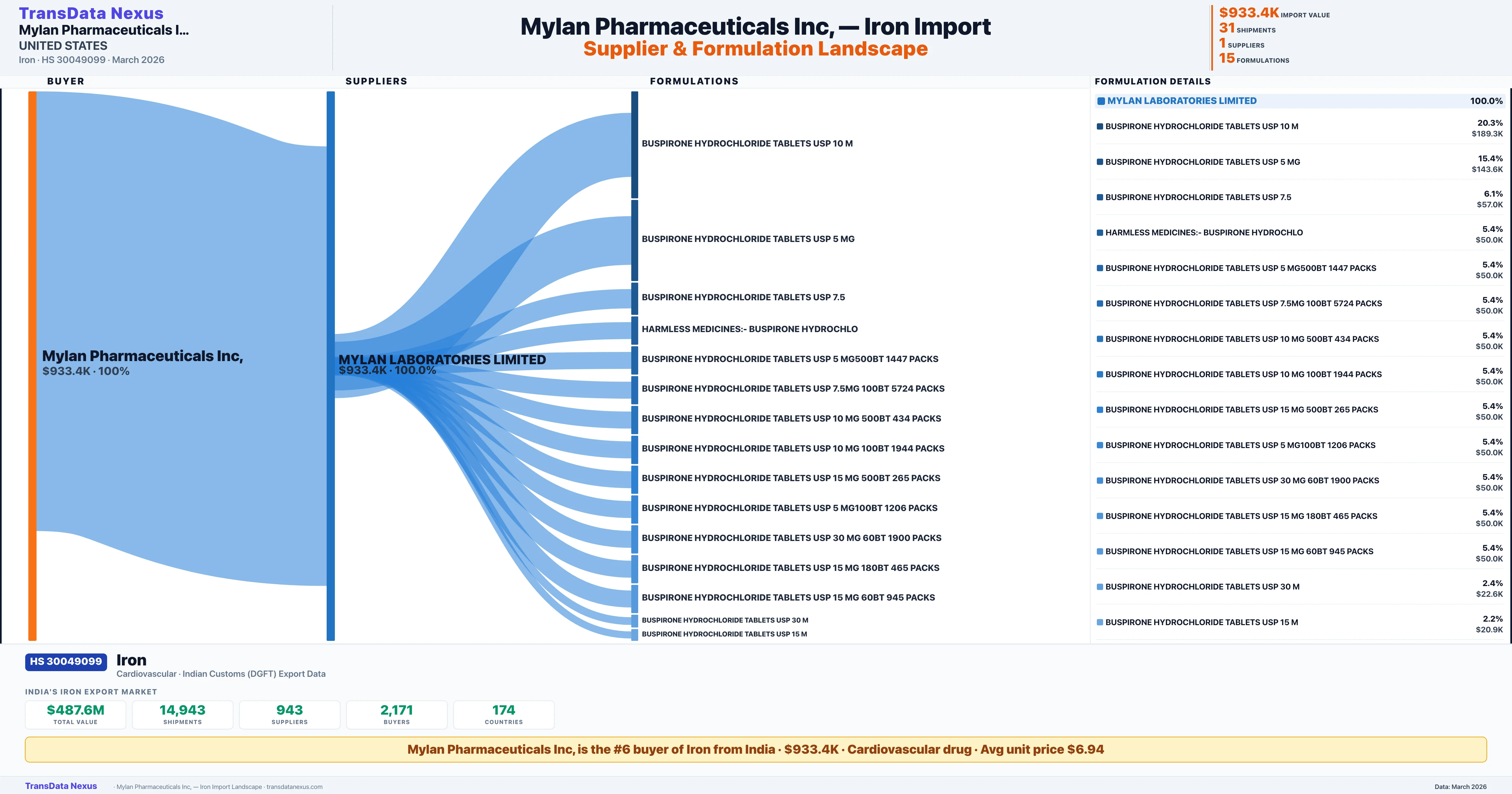 MYLAN PHARMACEUTICALS INC, imports 15 distinct Iron formulations from India. The top formulation is BUSPIRONE HYDROCHLORIDE TABLETS USP 10 M with 10 shipments worth $189.3K.
