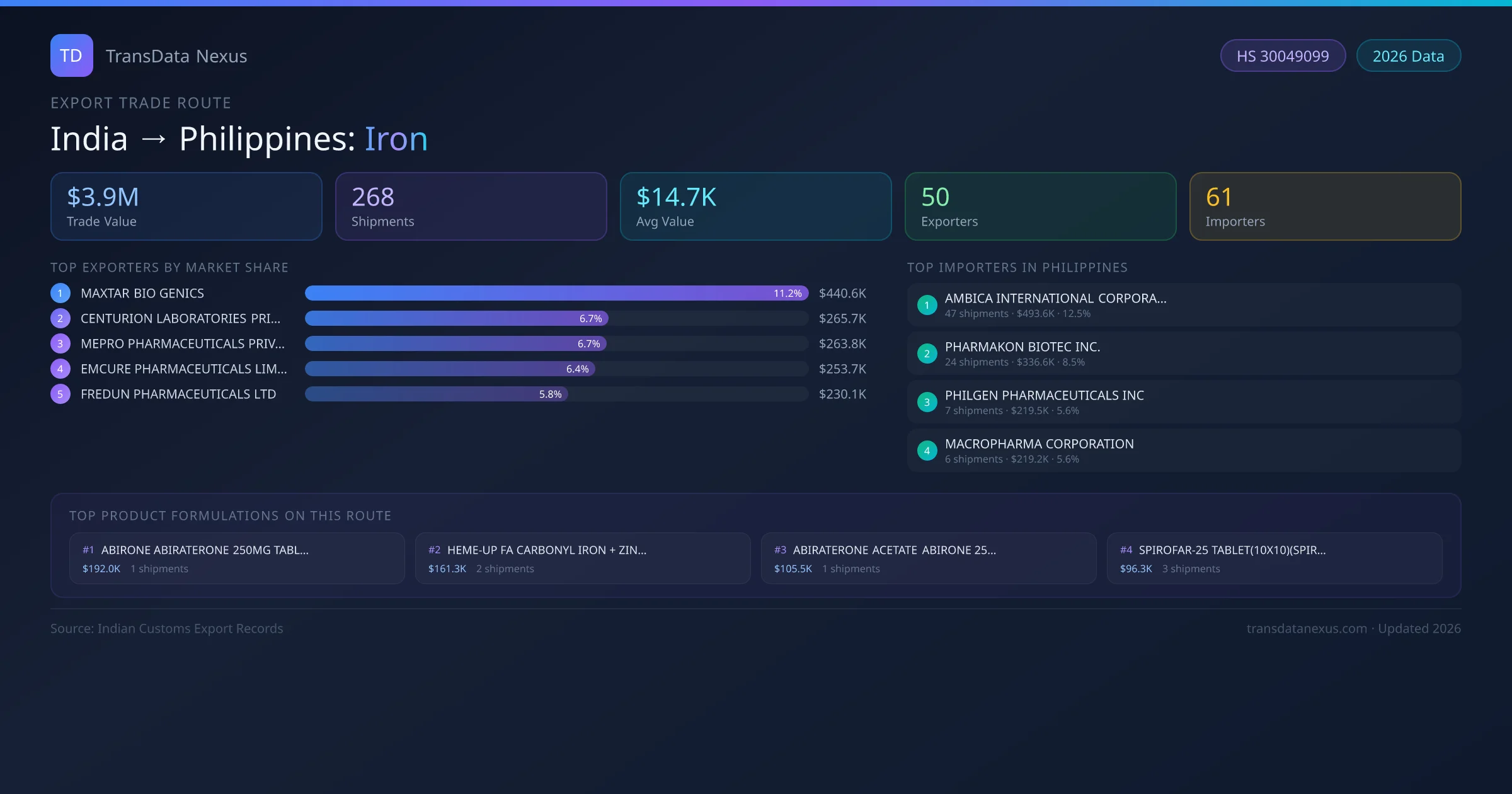 Showing top 10 of 200 product formulations shipped on the India to Philippines Iron route, ranked by trade value