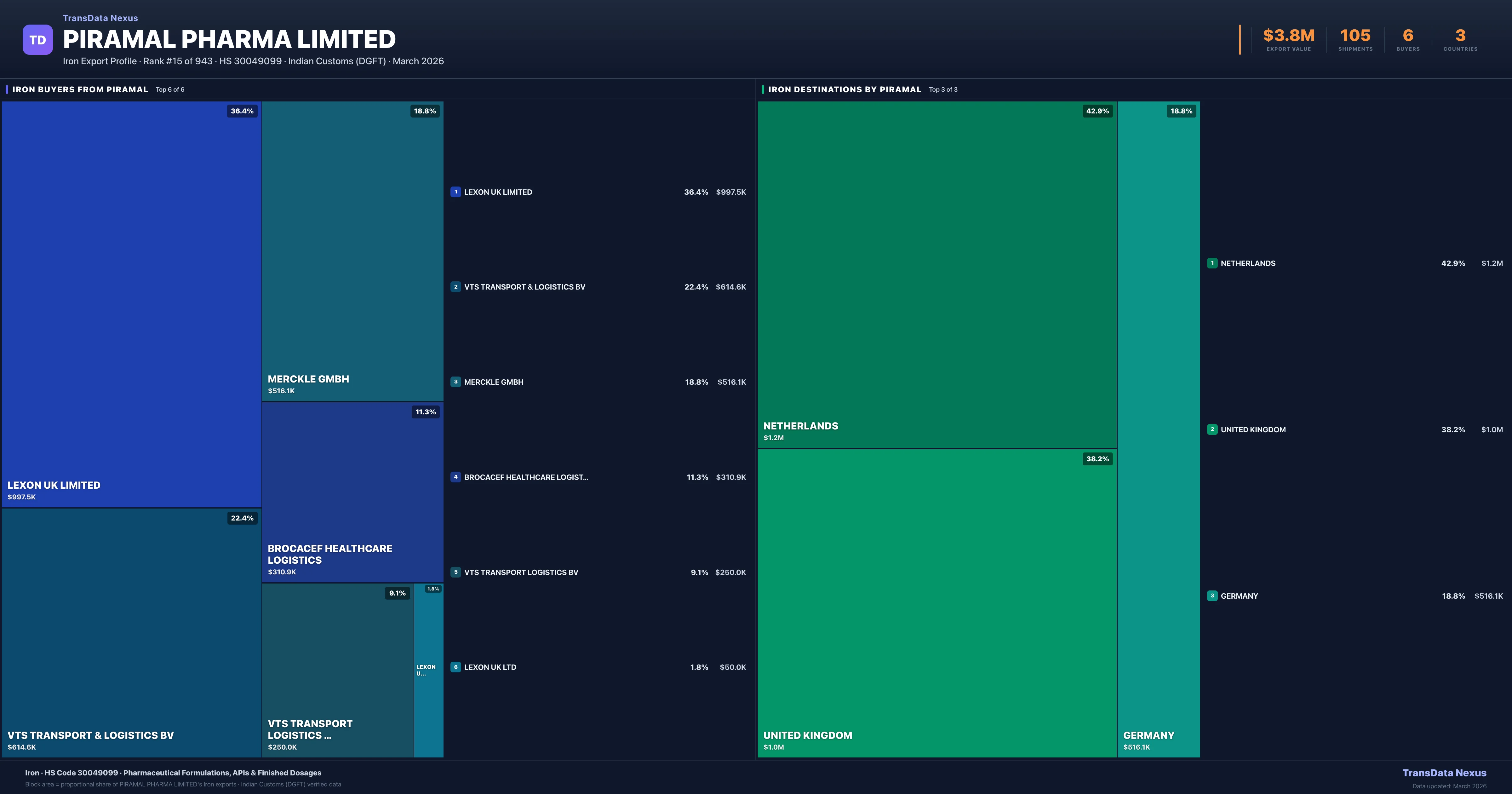 Piramal Pharma Limited supplies Iron to 6 buyers globally. The largest buyer is LEXON UK LIMITED (UNITED KINGDOM), followed by VTS TRANSPORT & LOGISTICS BV (NETHERLANDS) and MERCKLE GMBH (GERMANY). These buyers represent pharmaceutical distributors, hospital groups, and government procurement agencies in their respective markets.