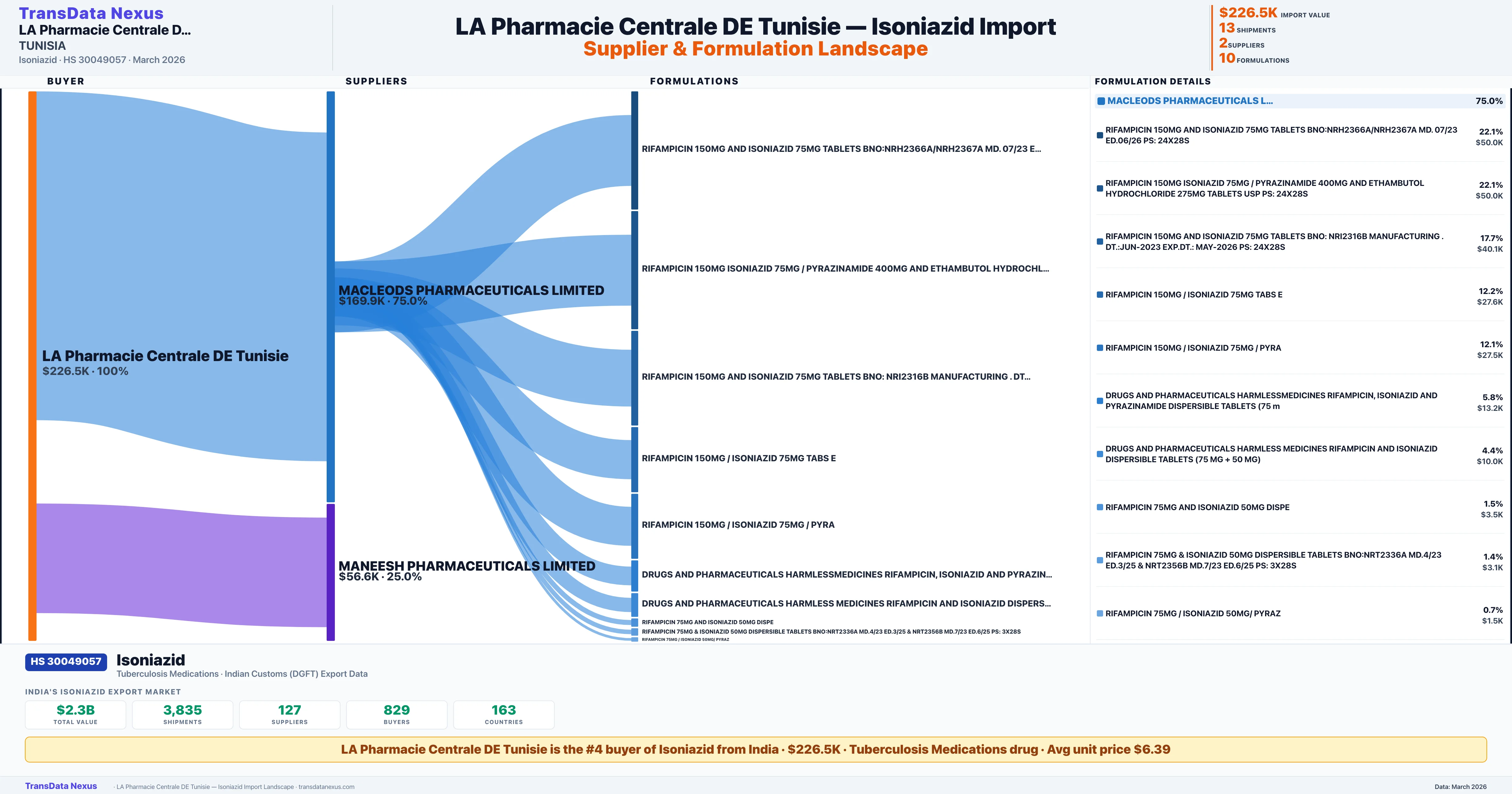 LA PHARMACIE CENTRALE DE TUNISIE sources Isoniazid from 2 verified Indian suppliers: MACLEODS PHARMACEUTICALS LIMITED ($169.9K, 75.0%), MANEESH PHARMACEUTICALS LIMITED ($56.6K, 25.0%). This is based on 13 customs records.