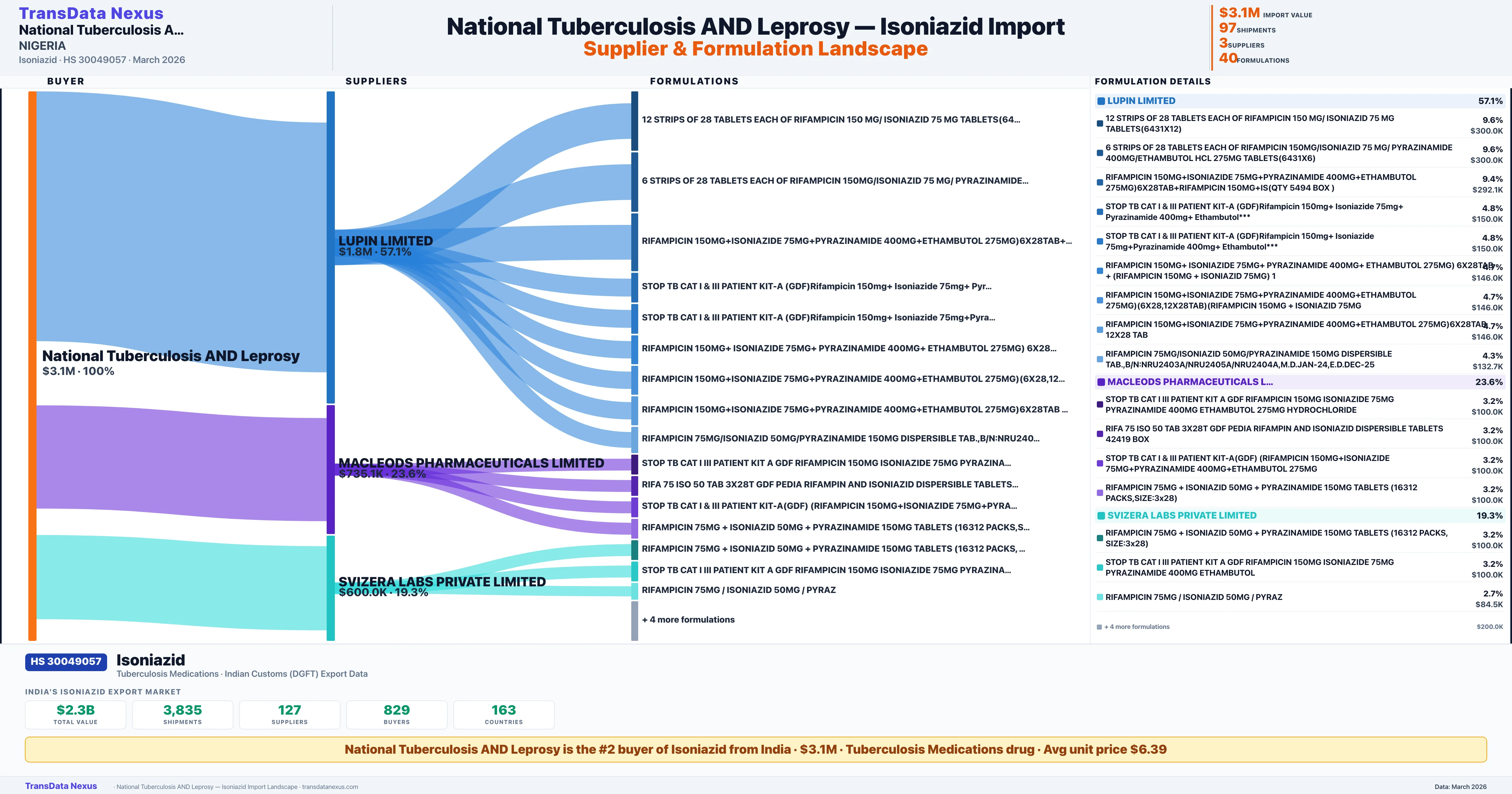 NATIONAL TUBERCULOSIS AND LEPROSY sources Isoniazid from 3 verified Indian suppliers: LUPIN LIMITED ($1.8M, 57.1%), MACLEODS PHARMACEUTICALS LIMITED ($735.1K, 23.6%), SVIZERA LABS PRIVATE LIMITED ($600.0K, 19.3%). This is based on 97 customs records.