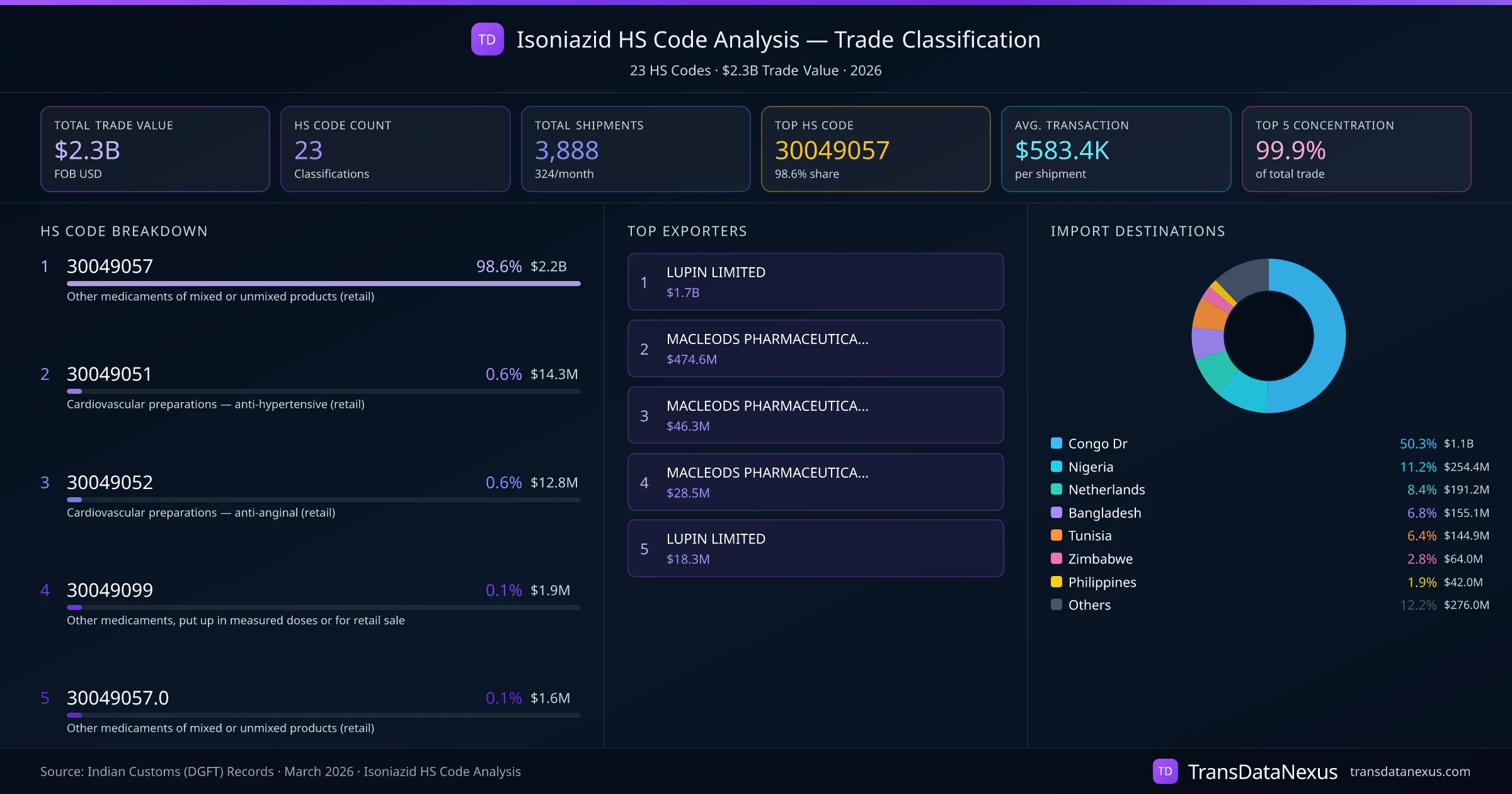 India exports Isoniazid under 23 distinct HS code classifications, representing a total trade value of $2.3B across 3,888 shipments. The dominant classification is HS 30049057 (Other medicaments of mixed or unmixed products (retail)), accounting for 98.6% of all Isoniazid trade at $2.2B. HS 30049051 (Cardiovascular preparations โ anti-hypertensive (retail)) follows at 0.6% ($14.3M). The top 5 HS codes together account for 99.9% of total Isoniazid trade from India. The average transaction value is $583411. Key importing markets include Congo Dr, Nigeria, Netherlands. Leading exporters include LUPIN LIMITED and MACLEODS PHARMACEUTICALS LTD. Data sourced from Indian Customs (DGFT) shipping bill records.
