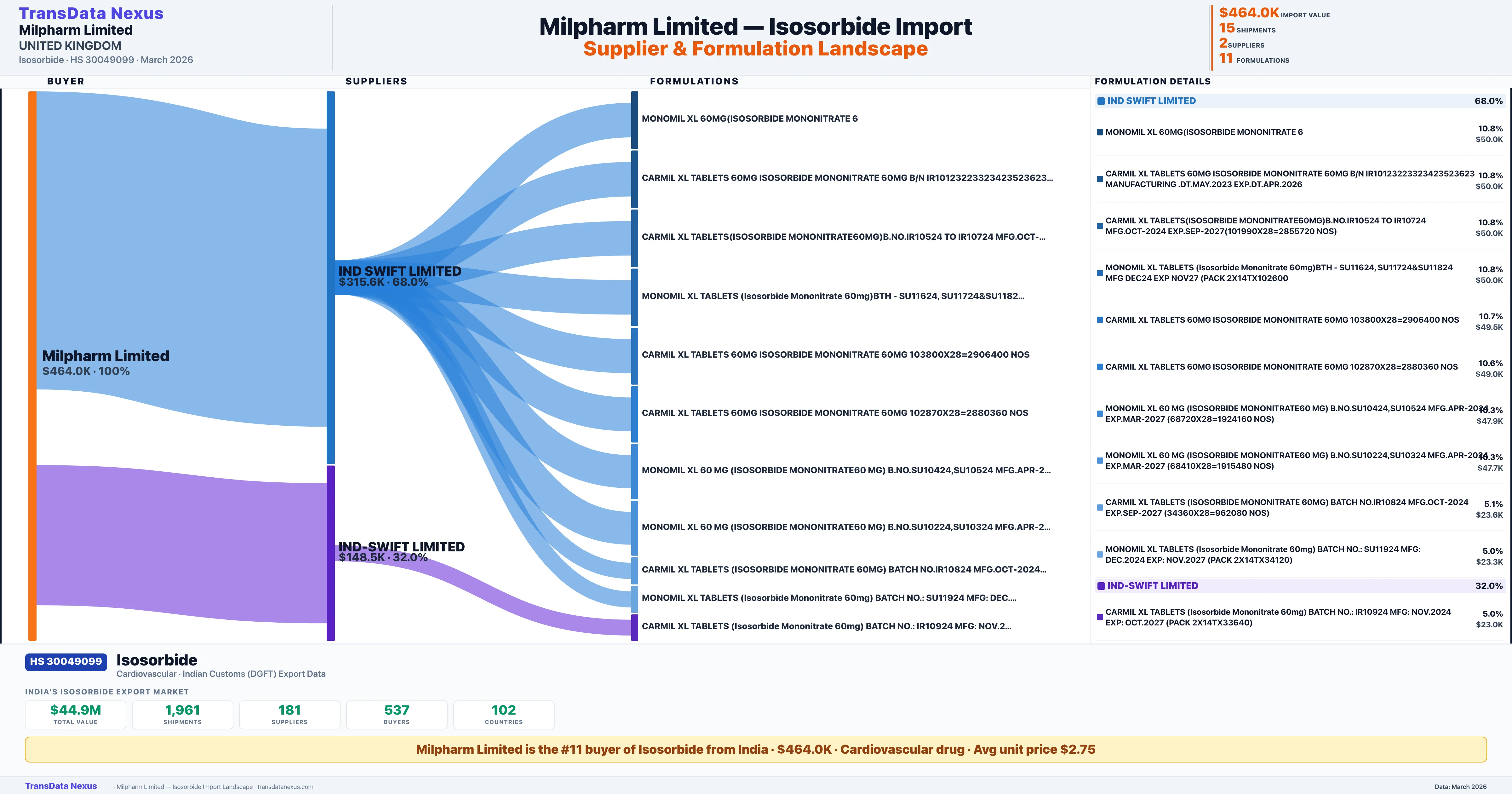 MILPHARM LIMITED sources Isosorbide from 2 verified Indian suppliers: IND SWIFT LIMITED ($315.6K, 68.0%), IND-SWIFT LIMITED ($148.5K, 32.0%). This is based on 15 customs records.