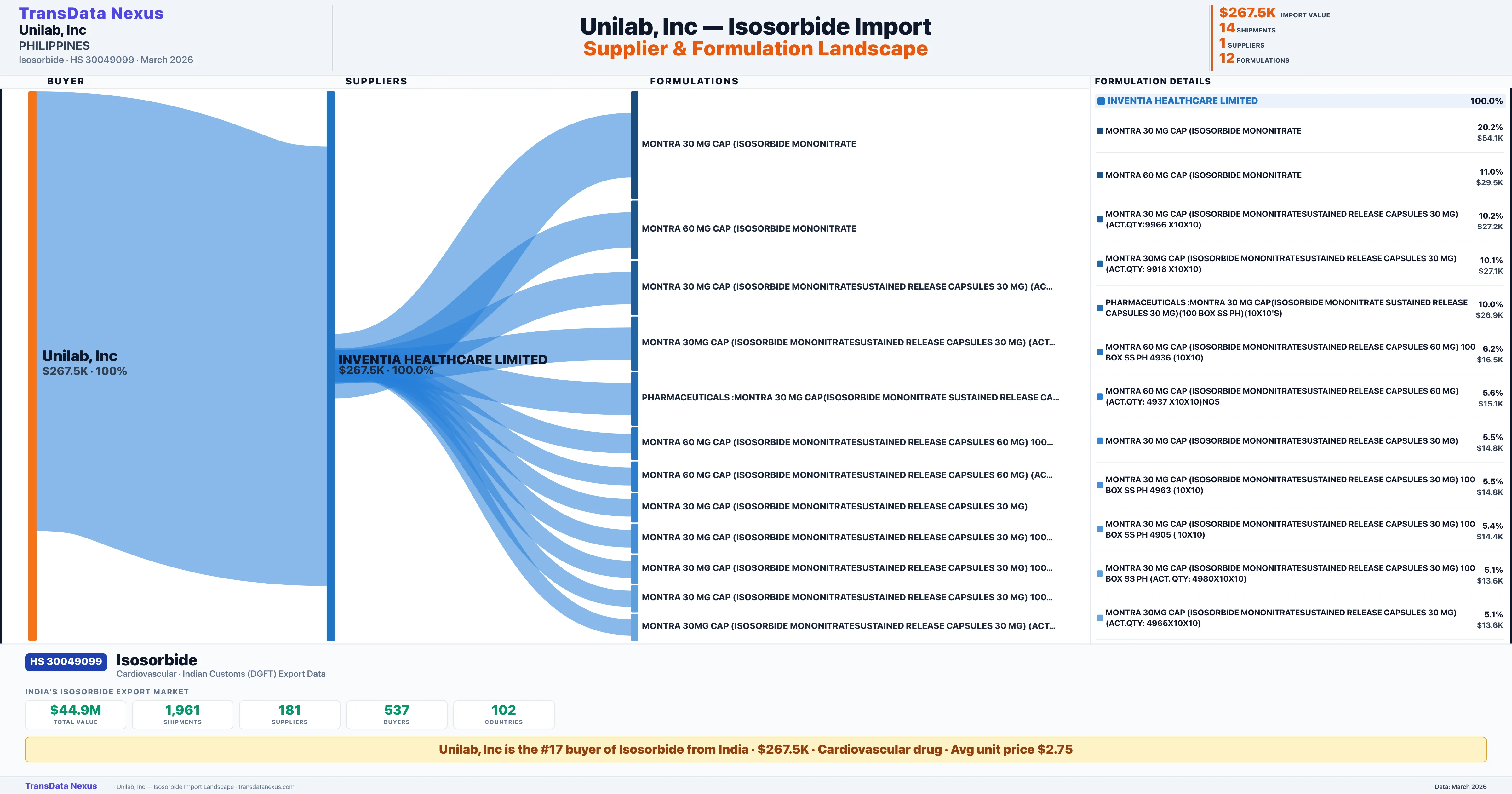 UNILAB, INC. sources Isosorbide from 1 verified Indian supplier: INVENTIA HEALTHCARE LIMITED ($267.5K, 100.0%). This is based on 14 customs records.
