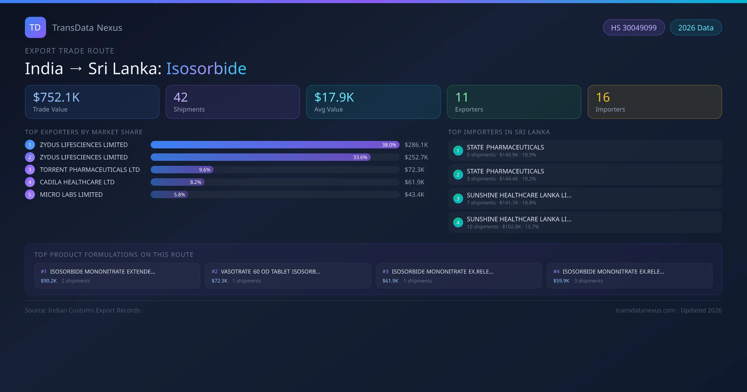 India has recorded 42 verified shipments of Isosorbide exported to Sri Lanka, representing a combined trade value of $752.1K USD. This corridor is served by 11 active Indian exporters, with an average shipment value of $17.9K USD. The leading Indian exporter is ZYDUS LIFESCIENCES LIMITED, which accounts for 38% of total export value with 10 shipments worth $286.1K USD. On the buying side, STATE PHARMACEUTICALS is the largest importer in Sri Lanka with $149.9K USD in purchases. The top 3 suppliers — ZYDUS LIFESCIENCES LIMITED, ZYDUS LIFESCIENCES LIMITED , TORRENT PHARMACEUTICALS LTD — together control 81% of total trade value on this route. All data sourced from Indian Customs (DGFT) shipping bill records. Values reported in FOB USD.
