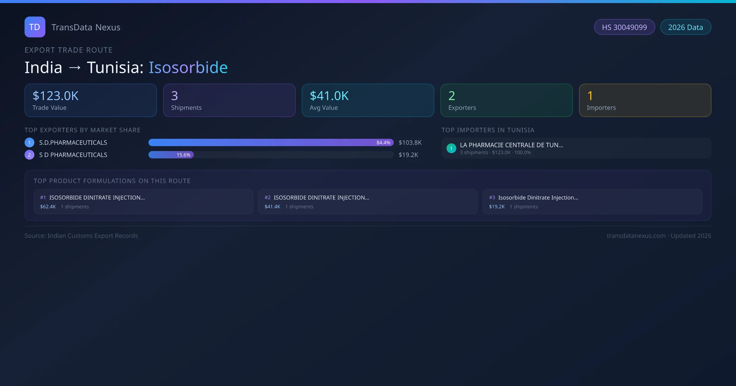 - 1.Route Identification: India to Tunisia export trade corridor identified from Indian Customs (DGFT) records for Isosorbide.