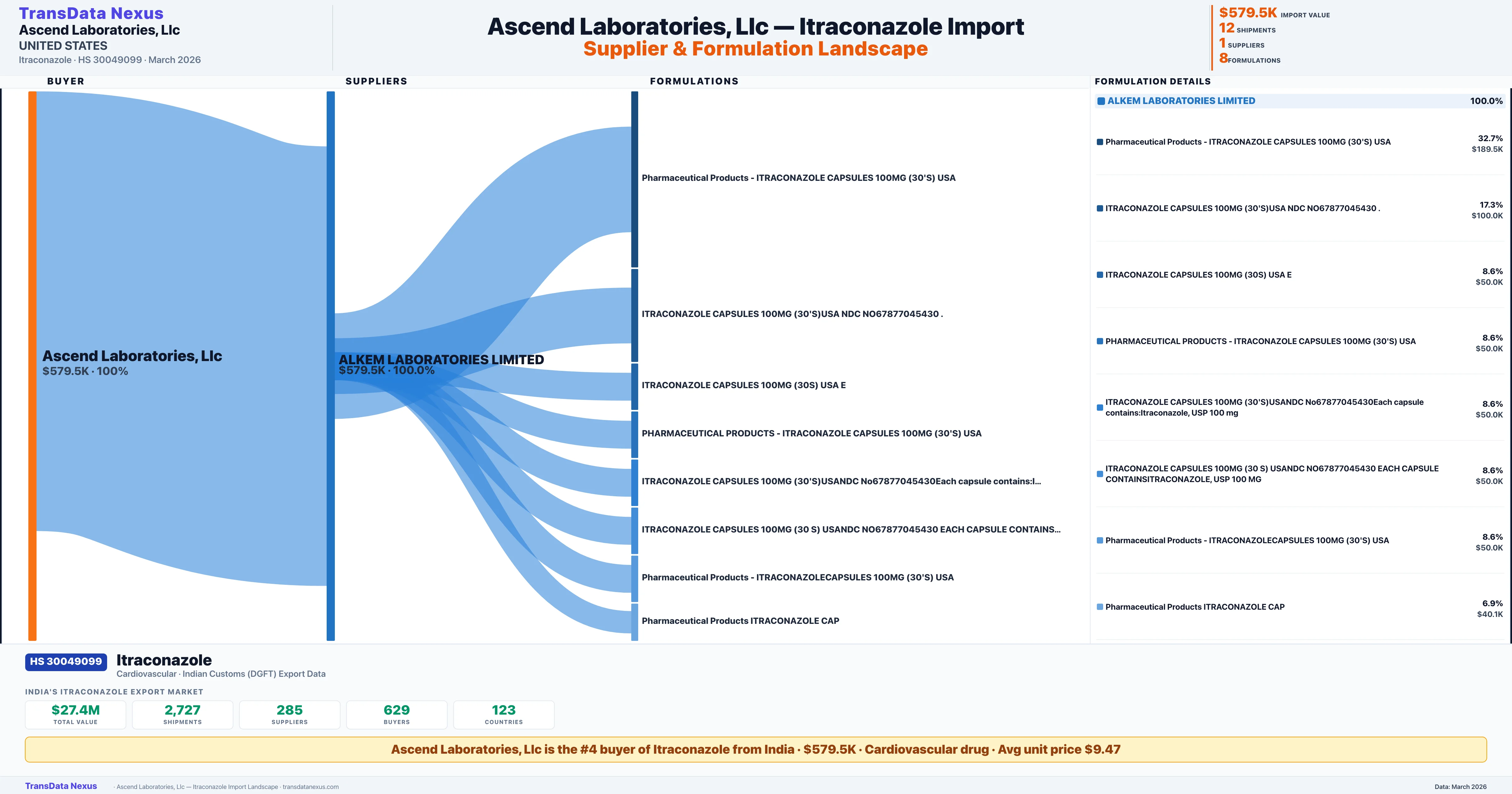 ASCEND LABORATORIES,LLC sources Itraconazole from 1 verified Indian supplier: ALKEM LABORATORIES LIMITED ($579.5K, 100.0%). This is based on 12 customs records.