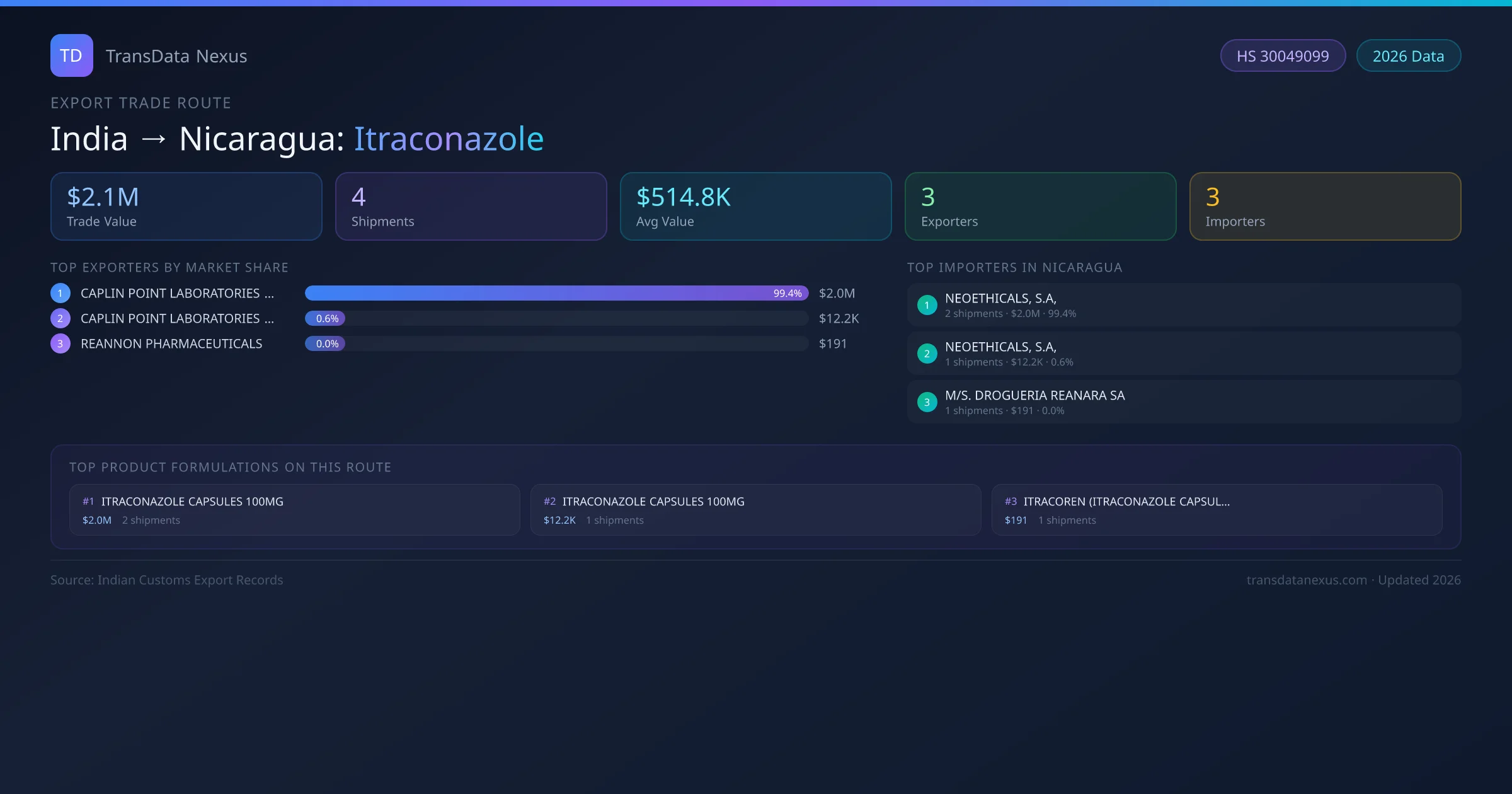 India has recorded 4 verified shipments of Itraconazole exported to Nicaragua, representing a combined trade value of $2.1M USD. This corridor is served by 3 active Indian exporters, with an average shipment value of $514.8K USD. The leading Indian exporter is CAPLIN POINT LABORATORIES LIMITED, which accounts for 99% of total export value with 2 shipments worth $2.0M USD. On the buying side, NEOETHICALS, S.A, is the largest importer in Nicaragua with $2.0M USD in purchases. The top 3 suppliers — CAPLIN POINT LABORATORIES LIMITED, CAPLIN POINT LABORATORIES LIMITED , REANNON PHARMACEUTICALS — together control 100% of total trade value on this route. All data sourced from Indian Customs (DGFT) shipping bill records. Values reported in FOB USD.