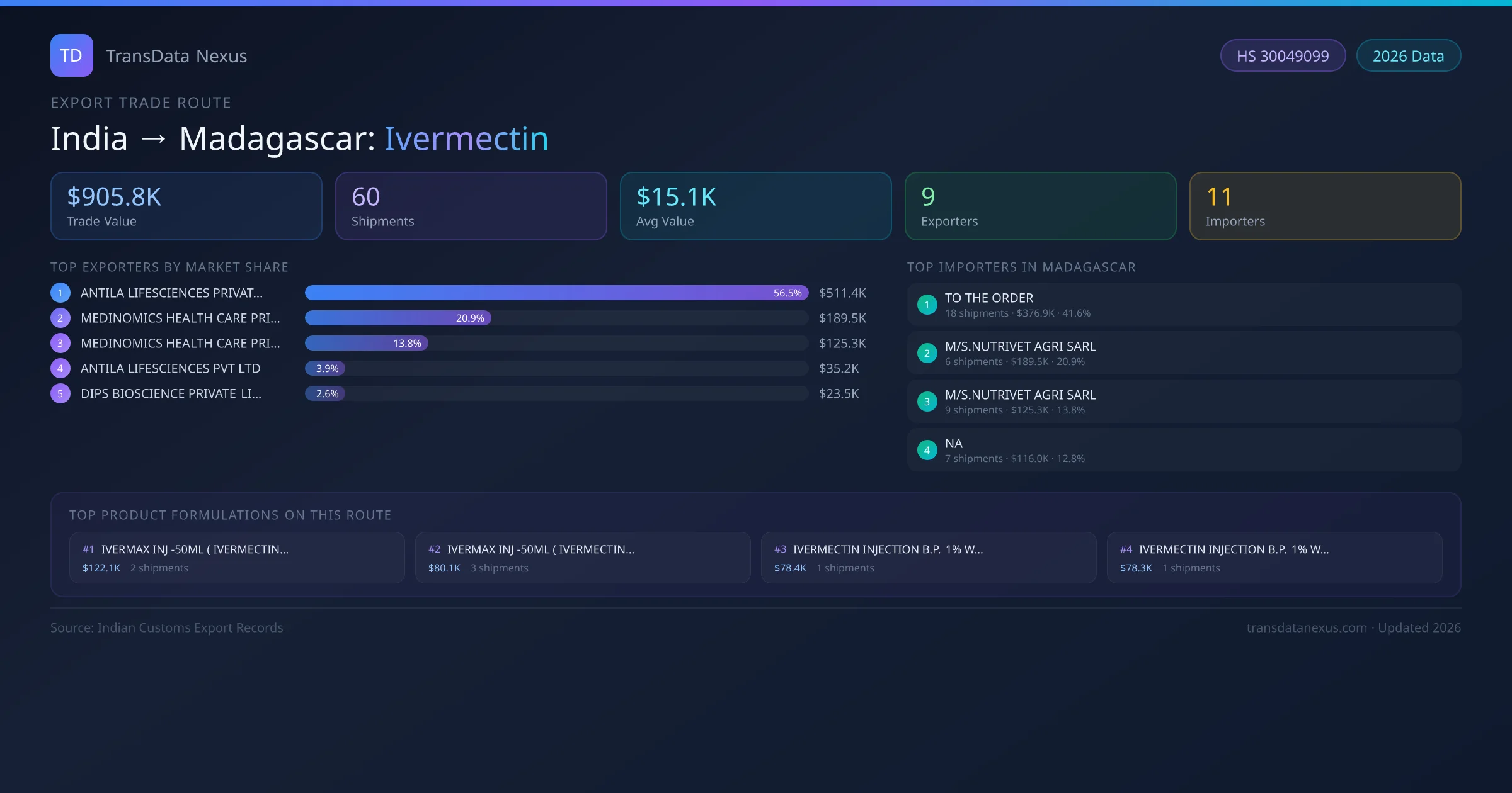 The India to Madagascar Ivermectin corridor is one of India's established pharmaceutical export routes, with 60 shipments documented worth a combined $905.8K USD. The route is dominated by ANTILA LIFESCIENCES PRIVATE LIMITED, which alone accounts for roughly 56% of all export value, reflecting the consolidated nature of India's ivermectin manufacturing sector.