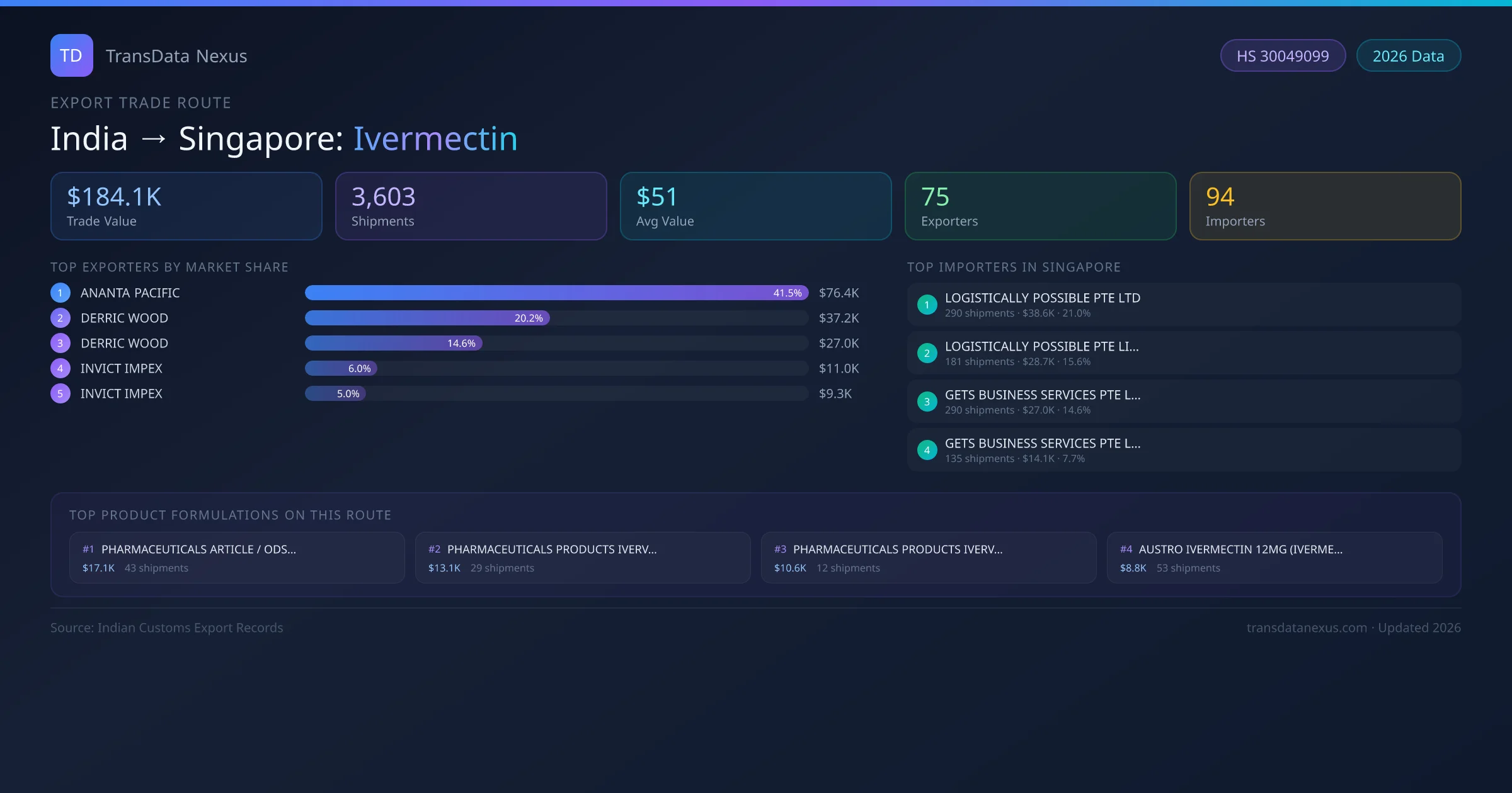 - 1.Route Identification: India to Singapore export trade corridor identified from Indian Customs (DGFT) records for Ivermectin.