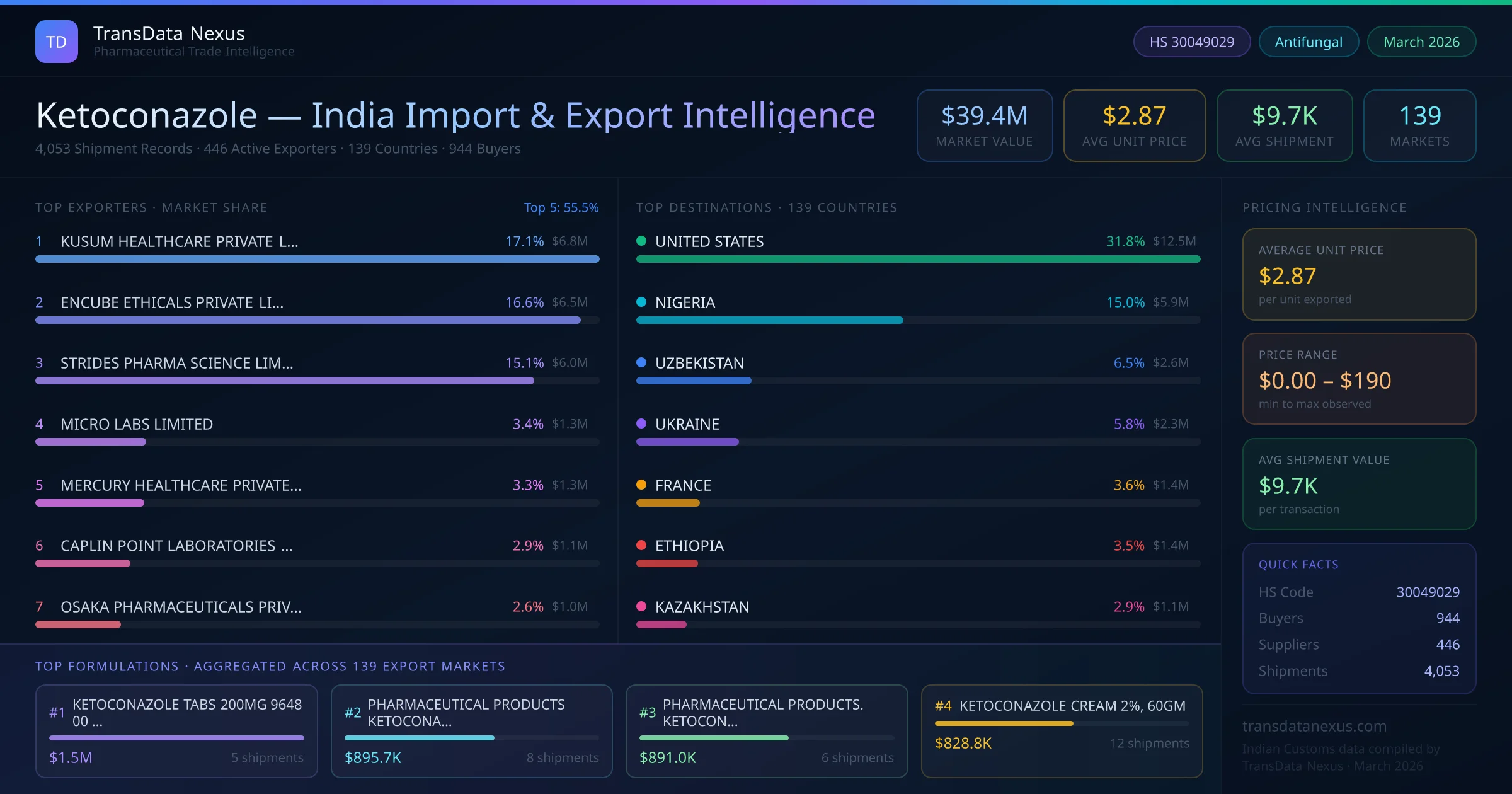 The average unit price for ketoconazole exports from India is $2.87 per unit, with prices ranging from $0.00 to $190.13 depending on formulation and order volume.