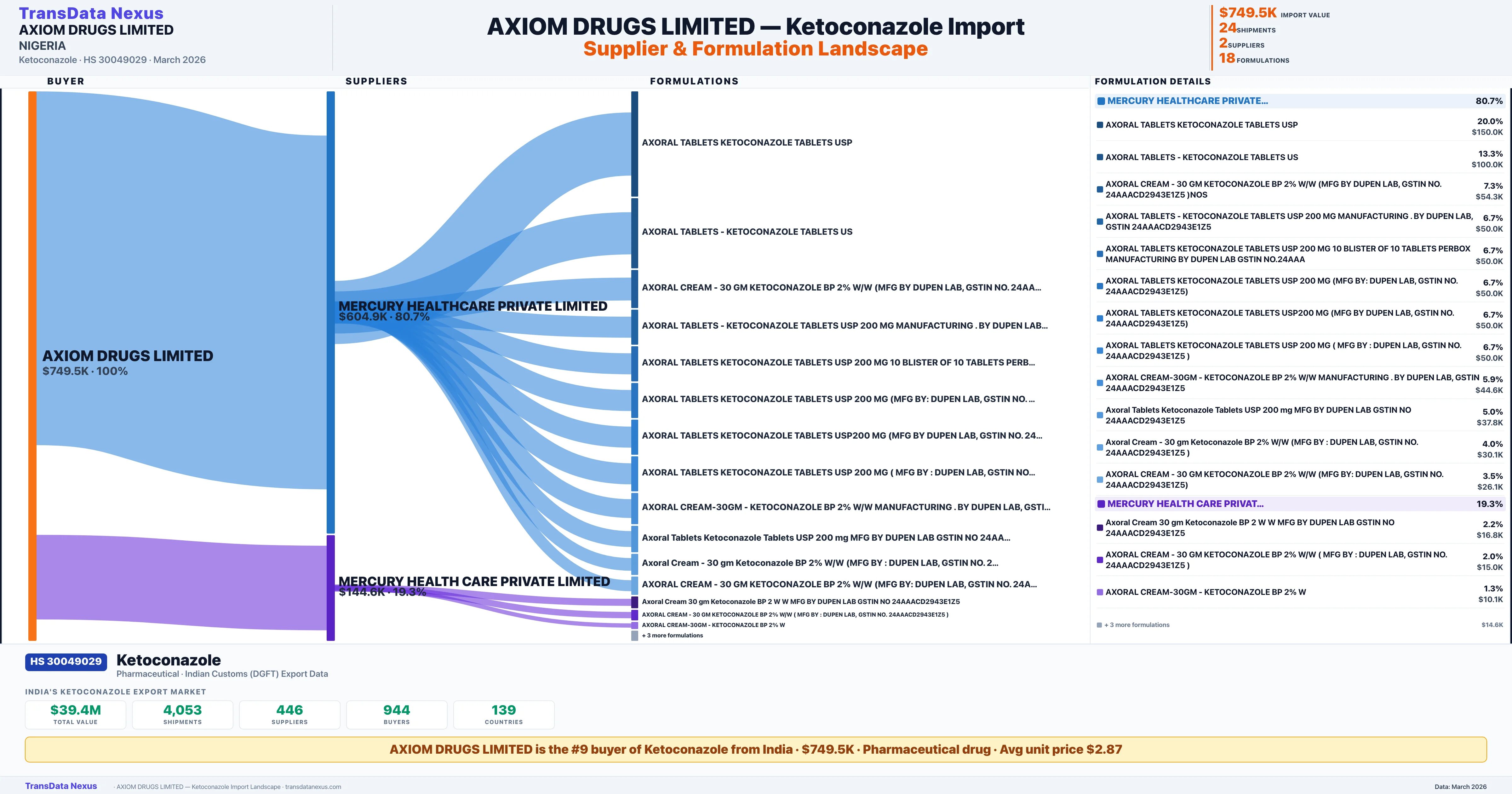 AXIOM DRUGS LIMITED sources Ketoconazole from 2 verified Indian suppliers: MERCURY HEALTHCARE PRIVATE LIMITED ($604.9K, 80.7%), MERCURY HEALTH CARE PRIVATE LIMITED ($144.6K, 19.3%). This is based on 24 customs records.