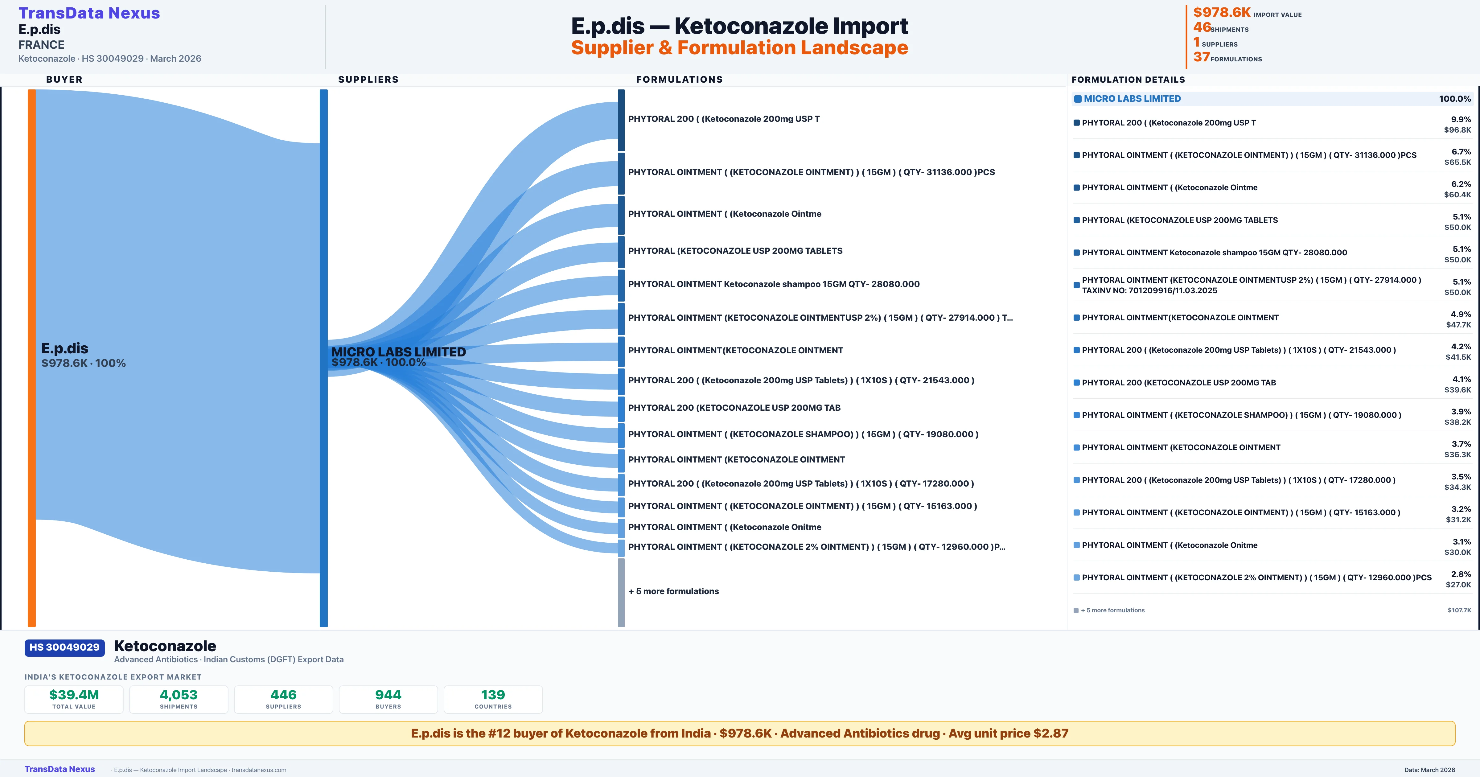 E.P.DIS sources Ketoconazole from 1 verified Indian supplier: MICRO LABS LIMITED ($978.6K, 100.0%). This is based on 46 customs records.