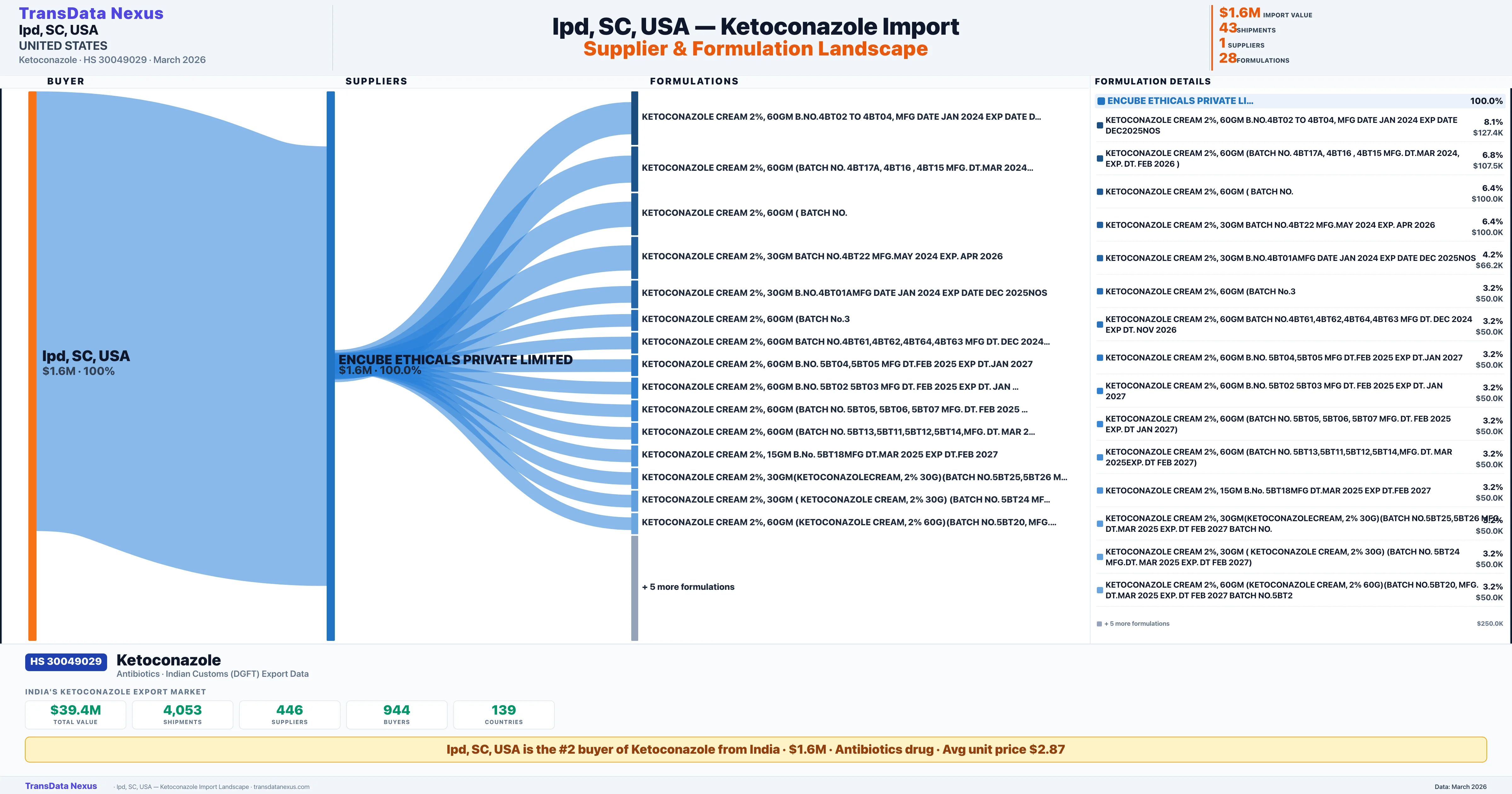 IPD, SC, USA sources Ketoconazole from 1 verified Indian supplier: ENCUBE ETHICALS PRIVATE LIMITED ($1.6M, 100.0%). This is based on 43 customs records.