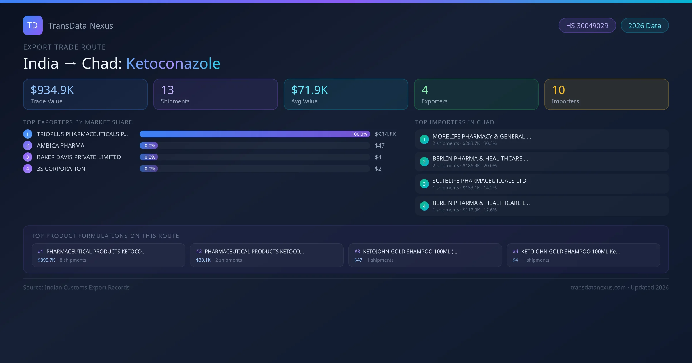 India has recorded 13 verified shipments of Ketoconazole exported to Chad, representing a combined trade value of $934.9K USD. This corridor is served by 4 active Indian exporters, with an average shipment value of $71.9K USD. The leading Indian exporter is TRIOPLUS PHARMACEUTICALS PRIVATE LIMITED, which accounts for 100% of total export value with 10 shipments worth $934.8K USD. On the buying side, MORELIFE PHARMACY & GENERAL MERCHA is the largest importer in Chad with $283.7K USD in purchases. The top 3 suppliers — TRIOPLUS PHARMACEUTICALS PRIVATE LIMITED, AMBICA PHARMA, BAKER DAVIS PRIVATE LIMITED — together control 100% of total trade value on this route. All data sourced from Indian Customs (DGFT) shipping bill records. Values reported in FOB USD.