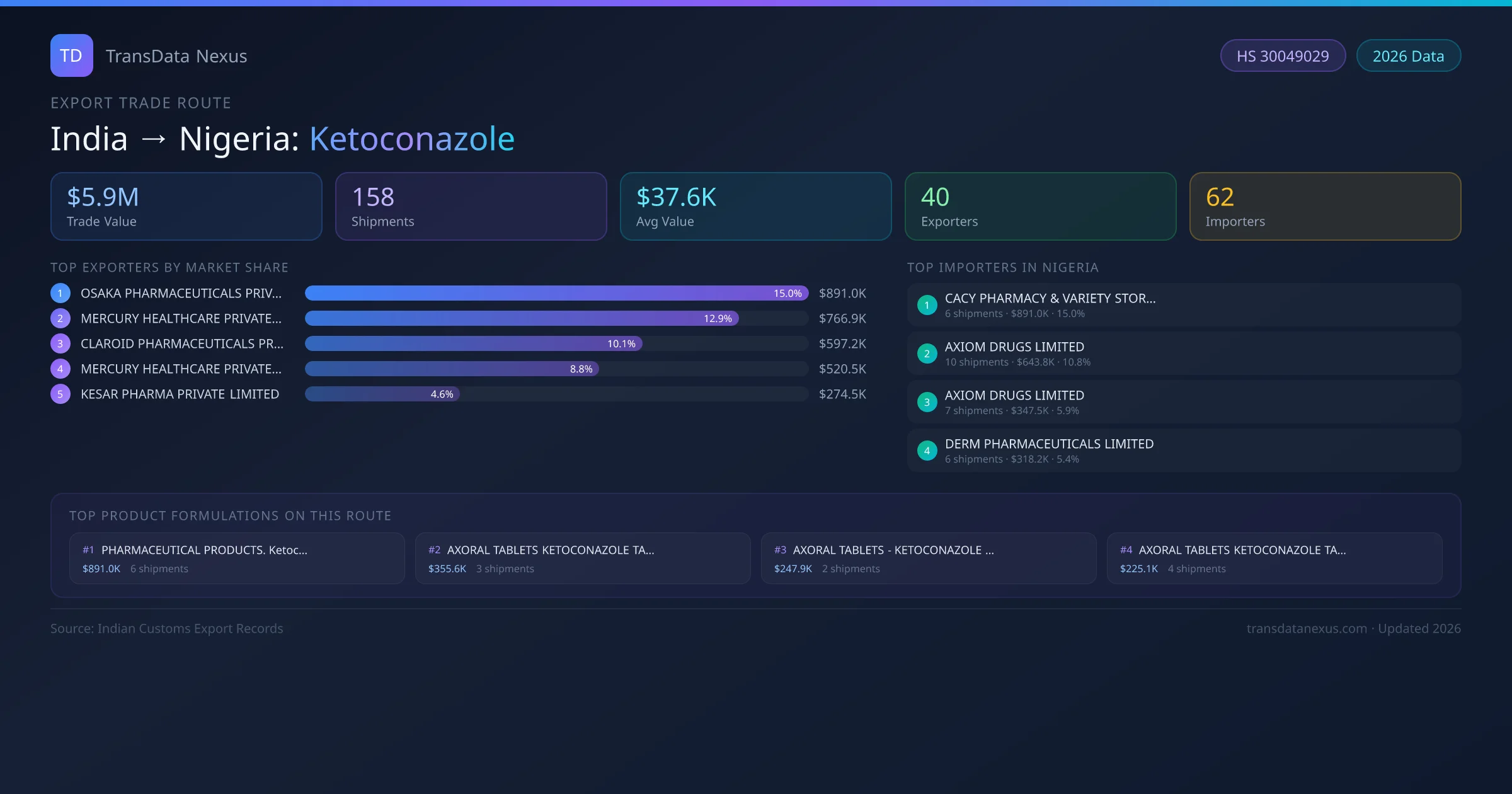 - 1.Route Identification: India to Nigeria export trade corridor identified from Indian Customs (DGFT) records for Ketoconazole.