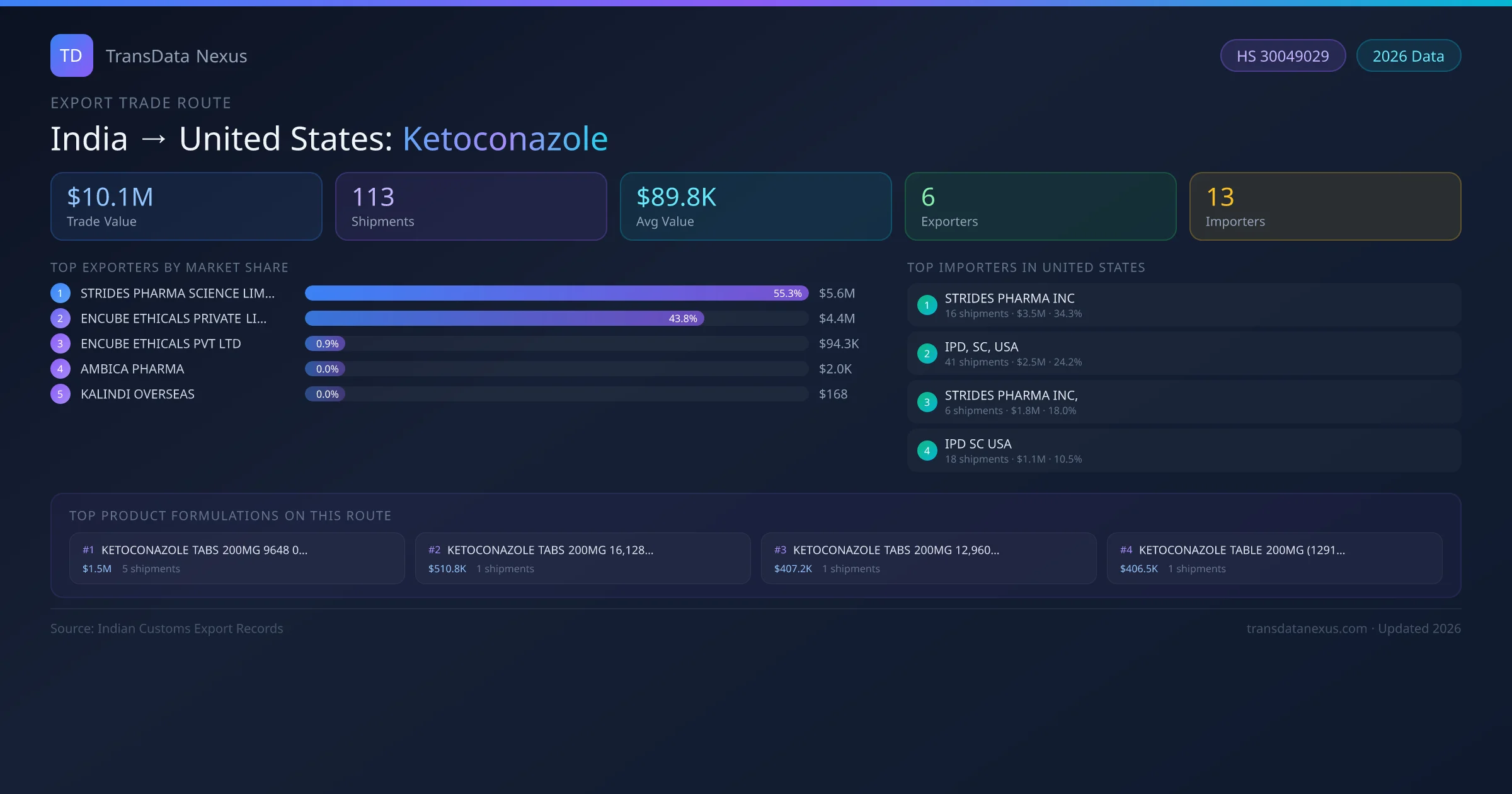 India has recorded 113 verified shipments of Ketoconazole exported to United States, representing a combined trade value of $10.1M USD. This corridor is served by 6 active Indian exporters, with an average shipment value of $89.8K USD. The leading Indian exporter is STRIDES PHARMA SCIENCE LIMITED, which accounts for 55% of total export value with 23 shipments worth $5.6M USD. On the buying side, STRIDES PHARMA INC is the largest importer in United States with $3.5M USD in purchases. The top 3 suppliers — STRIDES PHARMA SCIENCE LIMITED, ENCUBE ETHICALS PRIVATE LIMITED, ENCUBE ETHICALS PVT LTD — together control 100% of total trade value on this route. All data sourced from Indian Customs (DGFT) shipping bill records. Values reported in FOB USD.