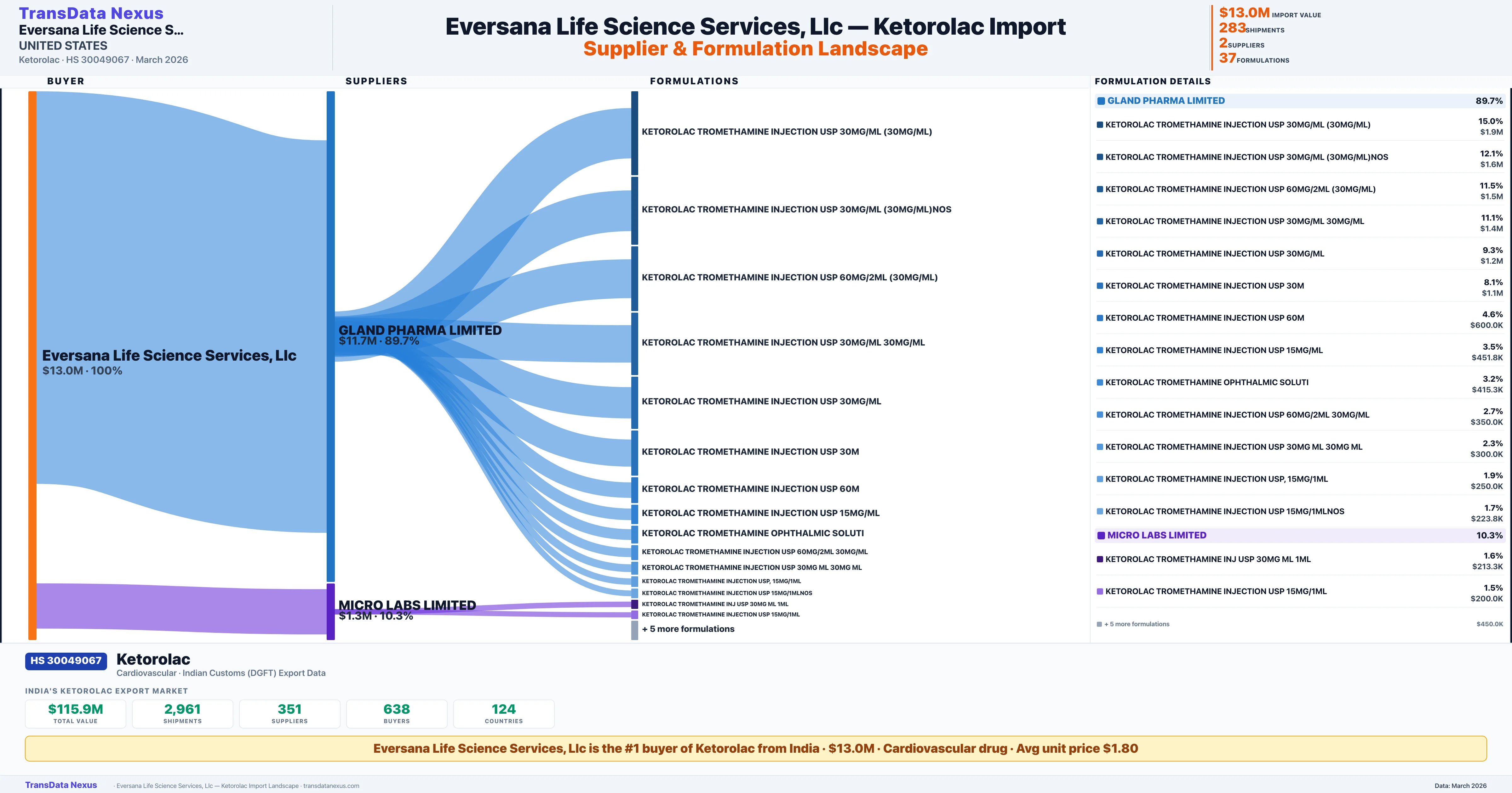 EVERSANA LIFE SCIENCE SERVICES, LLC sources Ketorolac from 2 verified Indian suppliers: GLAND PHARMA LIMITED ($11.7M, 89.7%), MICRO LABS LIMITED ($1.3M, 10.3%). This is based on 283 customs records.