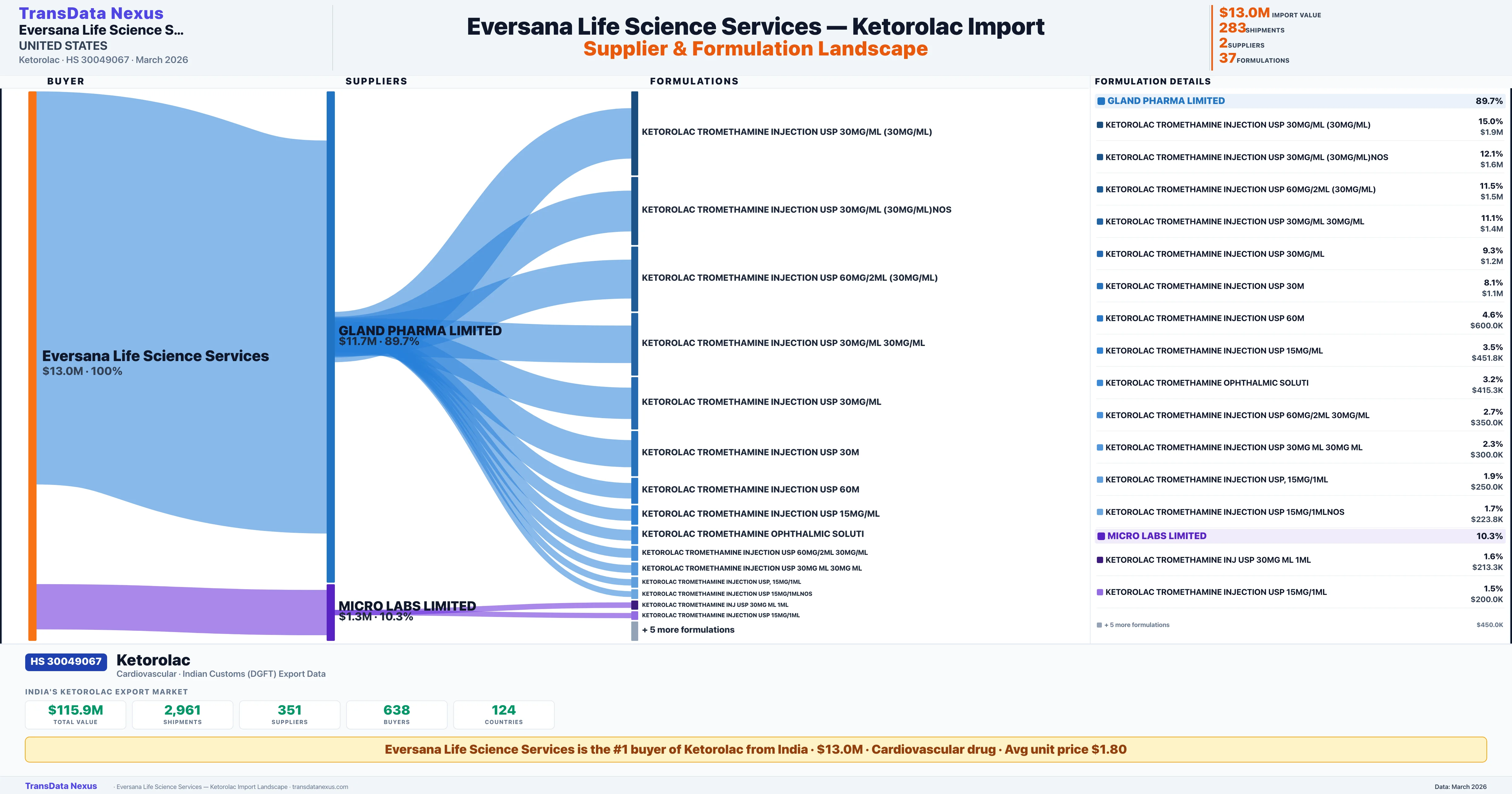 EVERSANA LIFE SCIENCE SERVICES sources Ketorolac from 2 verified Indian suppliers: GLAND PHARMA LIMITED ($11.7M, 89.7%), MICRO LABS LIMITED ($1.3M, 10.3%). This is based on 283 customs records.