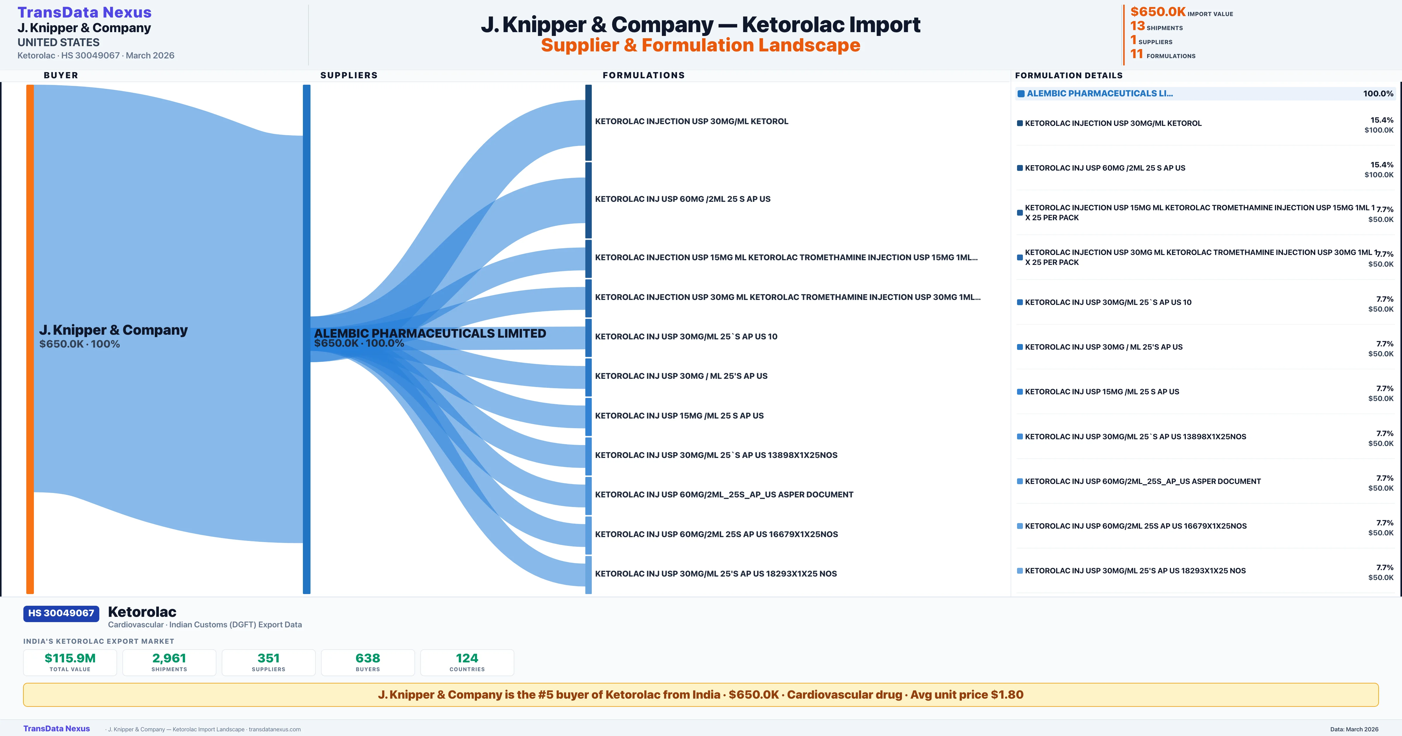 J KNIPPER COMPANY sources Ketorolac from 1 verified Indian supplier: ALEMBIC PHARMACEUTICALS LIMITED ($650.0K, 100.0%). This is based on 13 customs records.