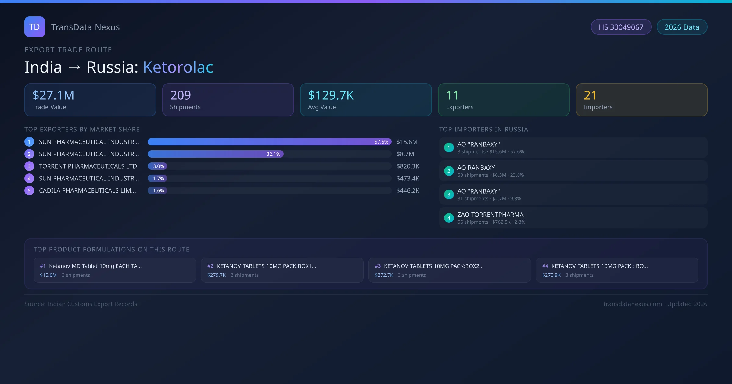 India has recorded 209 verified shipments of Ketorolac exported to Russia, representing a combined trade value of $27.1M USD. This corridor is served by 11 active Indian exporters, with an average shipment value of $129.7K USD. The leading Indian exporter is SUN PHARMACEUTICAL INDUSTRIES LIMITED , which accounts for 58% of total export value with 3 shipments worth $15.6M USD. On the buying side, AO "RANBAXY" is the largest importer in Russia with $15.6M USD in purchases. The top 3 suppliers — SUN PHARMACEUTICAL INDUSTRIES LIMITED , SUN PHARMACEUTICAL INDUSTRIES LIMITED, TORRENT PHARMACEUTICALS LTD — together control 93% of total trade value on this route. All data sourced from Indian Customs (DGFT) shipping bill records. Values reported in FOB USD.