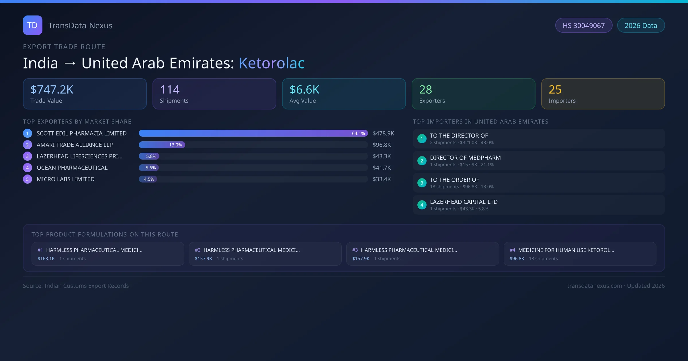 The India to United Arab Emirates Ketorolac corridor is one of India's established pharmaceutical export routes, with 114 shipments documented worth a combined $747.2K USD. The route is dominated by SCOTT EDIL PHARMACIA LIMITED, which alone accounts for roughly 64% of all export value, reflecting the consolidated nature of India's ketorolac manufacturing sector.