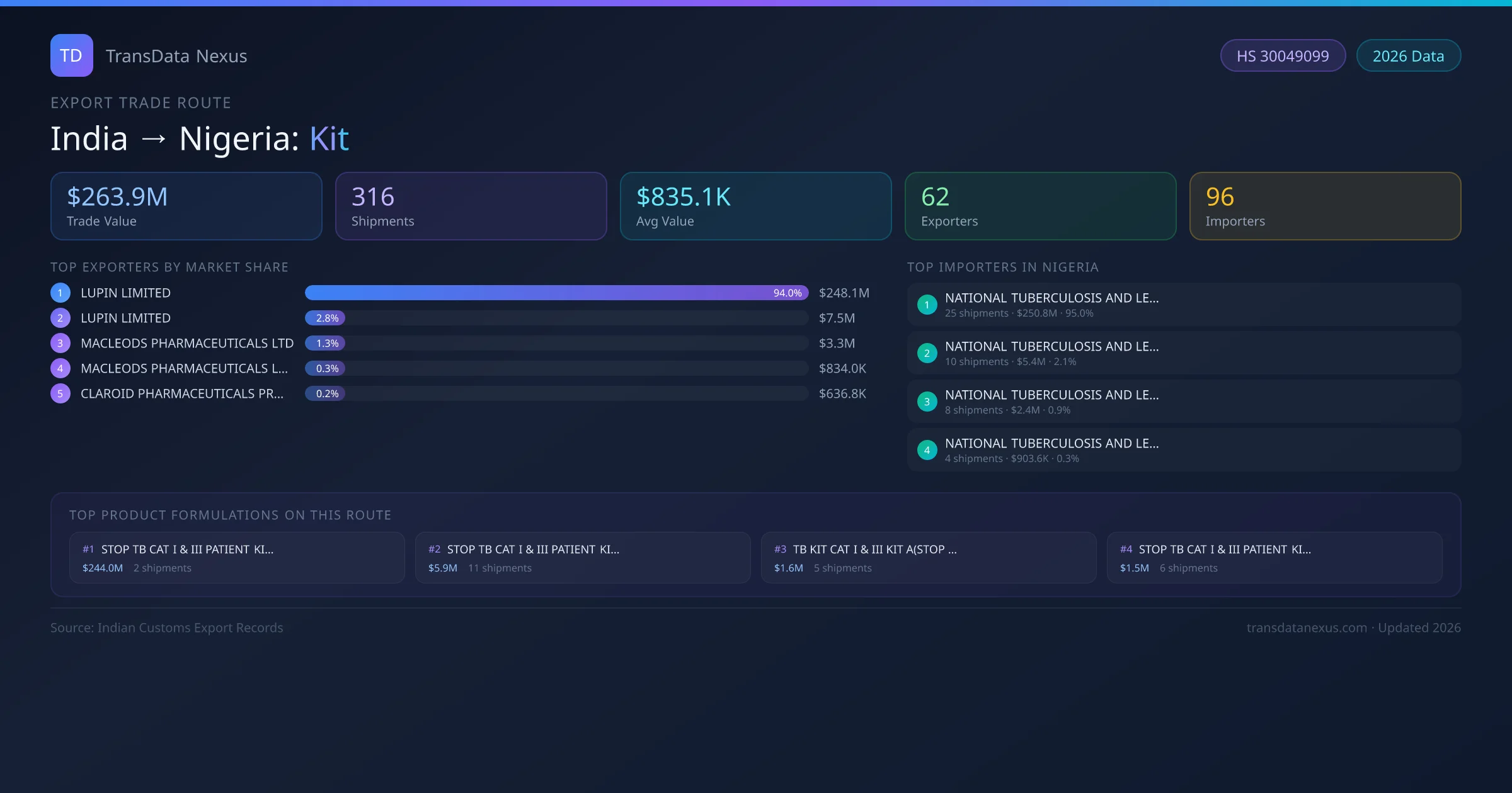 India has recorded 316 verified shipments of Kit exported to Nigeria, representing a combined trade value of $263.9M USD. This corridor is served by 62 active Indian exporters, with an average shipment value of $835.1K USD. The leading Indian exporter is LUPIN LIMITED, which accounts for 94% of total export value with 20 shipments worth $248.1M USD. On the buying side, NATIONAL TUBERCULOSIS AND LEPROSY is the largest importer in Nigeria with $250.8M USD in purchases. The top 3 suppliers — LUPIN LIMITED, LUPIN LIMITED , MACLEODS PHARMACEUTICALS LTD — together control 98% of total trade value on this route. All data sourced from Indian Customs (DGFT) shipping bill records. Values reported in FOB USD.