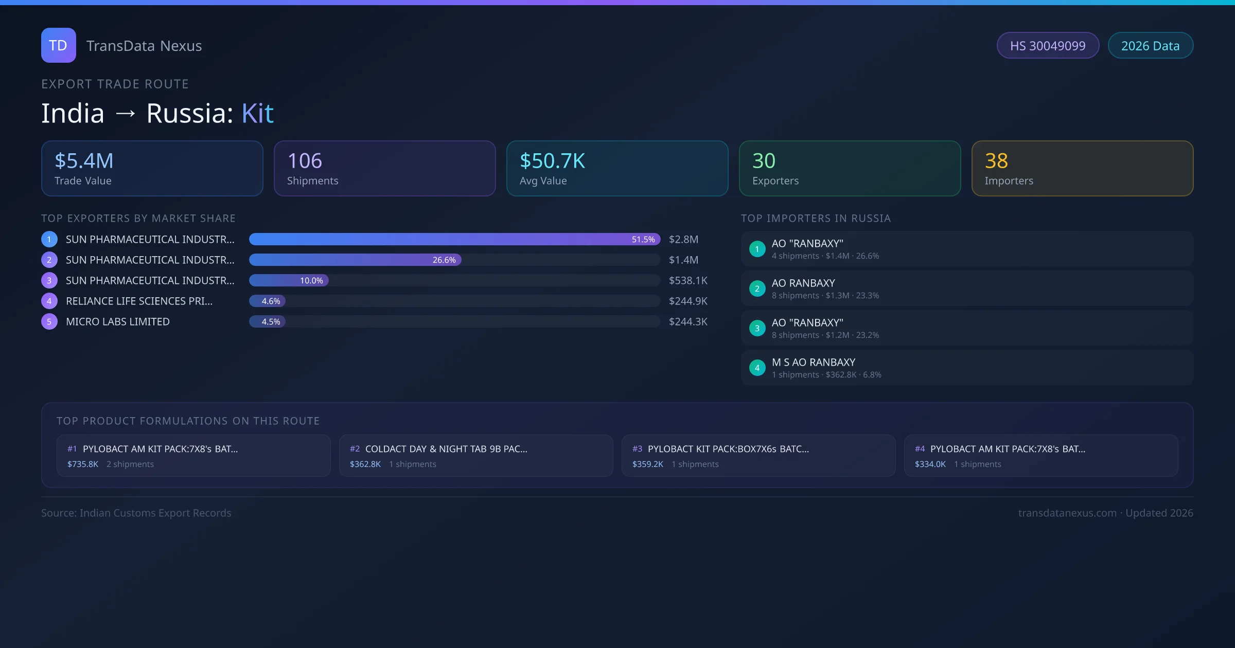 India has recorded 106 verified shipments of Kit exported to Russia, representing a combined trade value of $5.4M USD. This corridor is served by 30 active Indian exporters, with an average shipment value of $50.7K USD. The leading Indian exporter is SUN PHARMACEUTICAL INDUSTRIES LIMITED, which accounts for 52% of total export value with 17 shipments worth $2.8M USD. On the buying side, AO "RANBAXY" is the largest importer in Russia with $1.4M USD in purchases. The top 3 suppliers — SUN PHARMACEUTICAL INDUSTRIES LIMITED, SUN PHARMACEUTICAL INDUSTRIES LIMITED , SUN PHARMACEUTICAL INDUSTRIES LTD — together control 88% of total trade value on this route. All data sourced from Indian Customs (DGFT) shipping bill records. Values reported in FOB USD.